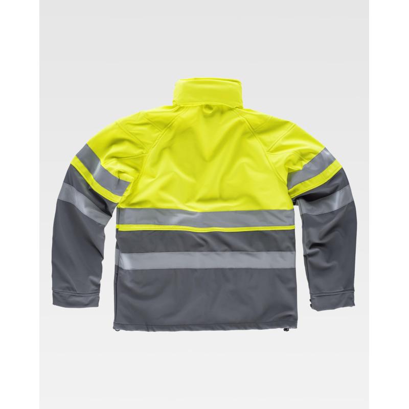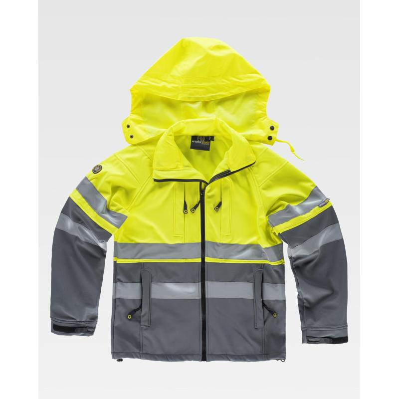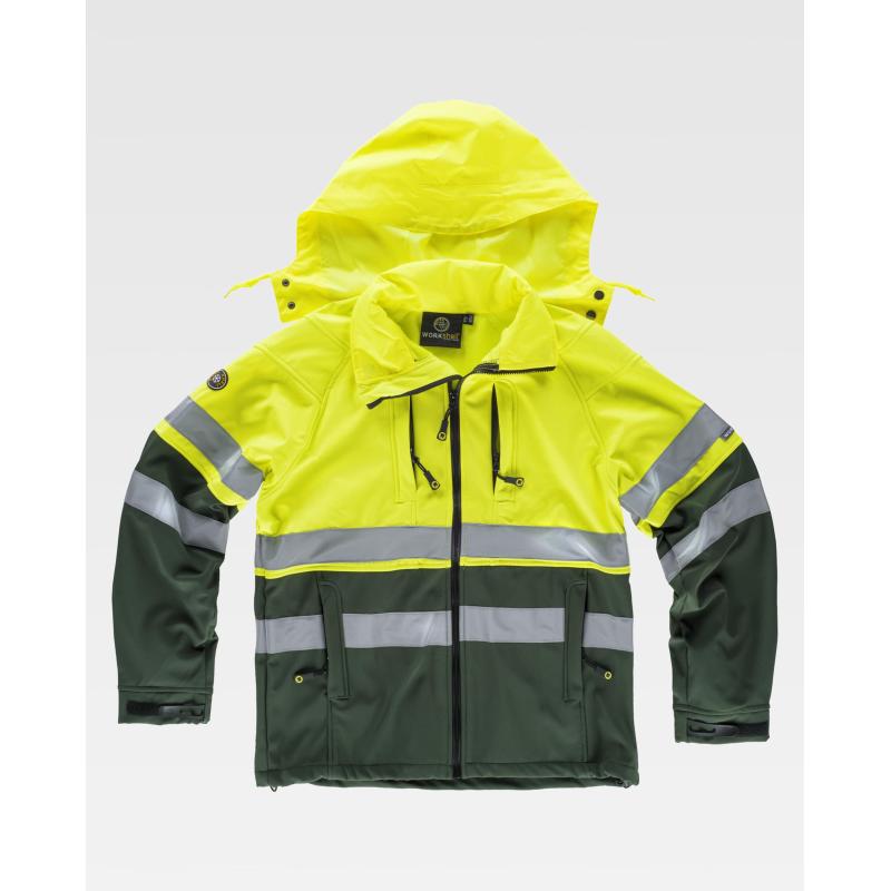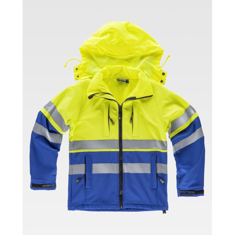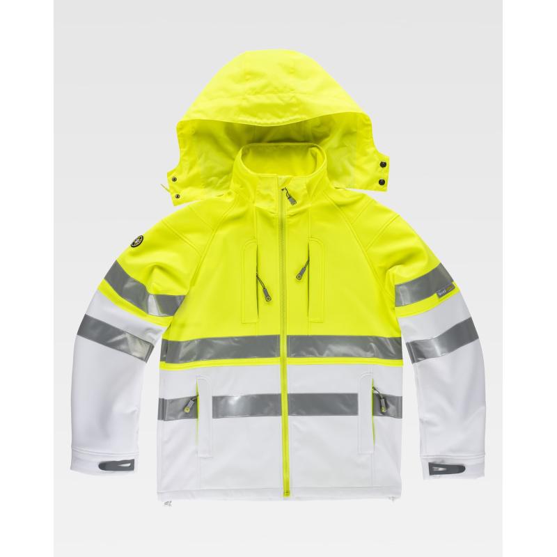 Chaqueta Workshell combinada con cintas reflectantes. Parte superior de alta visibilidad. Cuello alto y capucha enrollable con cordón para ajustar. Cierre de cremallera. Solapa protectora interior vuelta en la parte superior cubriendo la cremallera. Dos bolsos de pecho y dos laterales interiores con cremallera. Dos cintas reflectantes en pecho, espalda y mangas. Manga ranglan y puños ajustables con velcro. Cortes decorativos. Cordón elástico con pieza ajustable en bajo. Tejido corta vientos, repelente al agua y resistente al desgarro con membrana interior transpirable y aislante e interior de alta capacidad térmica. 96% Poliéster 4% Elastano