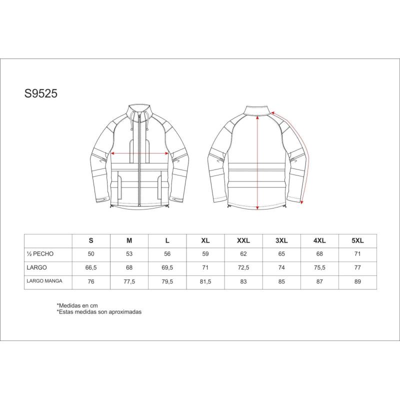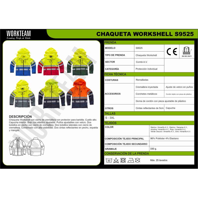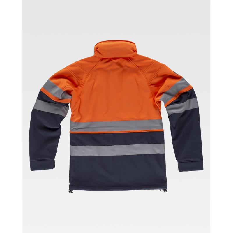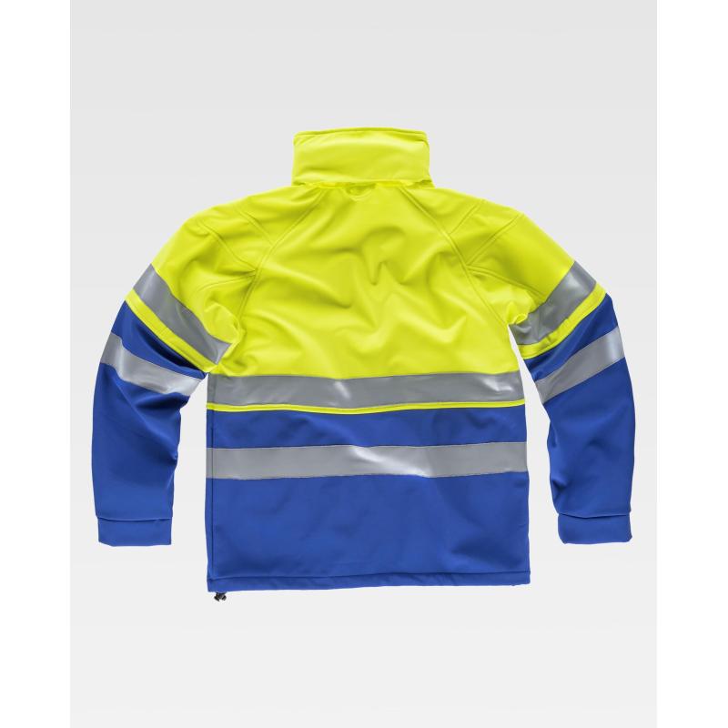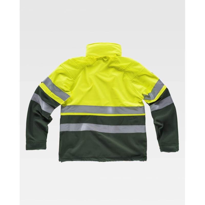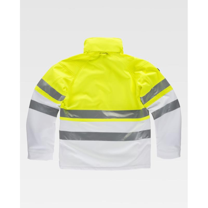 Chaqueta Workshell combinada con cintas reflectantes. Parte superior de alta visibilidad. Cuello alto y capucha enrollable con cordón para ajustar. Cierre de cremallera. Solapa protectora interior vuelta en la parte superior cubriendo la cremallera. Dos bolsos de pecho y dos laterales interiores con cremallera. Dos cintas reflectantes en pecho, espalda y mangas. Manga ranglan y puños ajustables con velcro. Cortes decorativos. Cordón elástico con pieza ajustable en bajo. Tejido corta vientos, repelente al agua y resistente al desgarro con membrana interior transpirable y aislante e interior de alta capacidad térmica. 96% Poliéster 4% Elastano