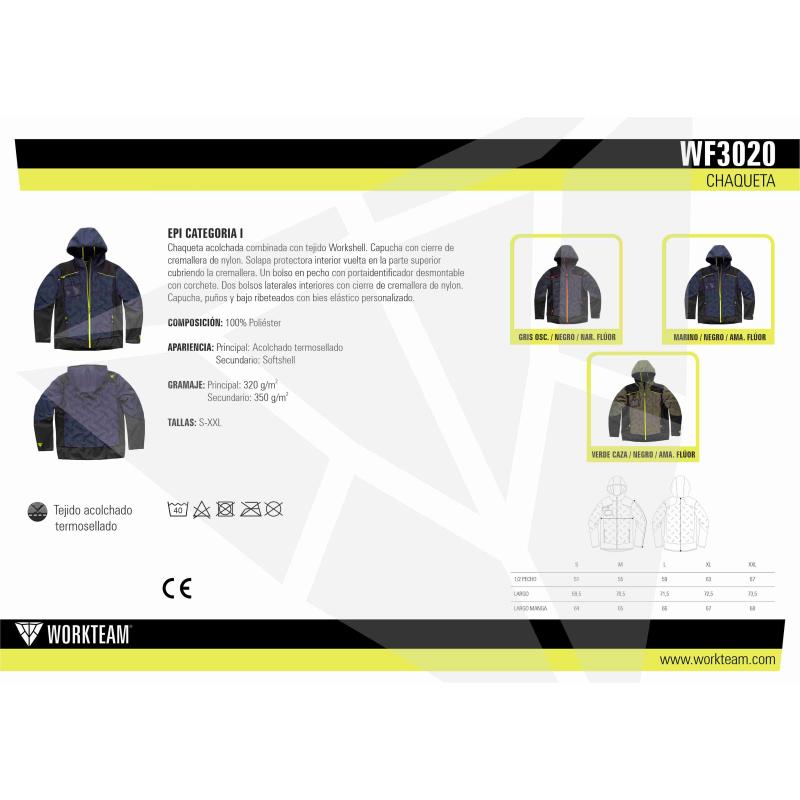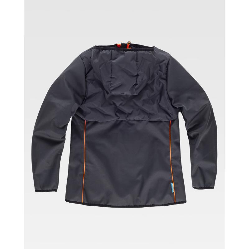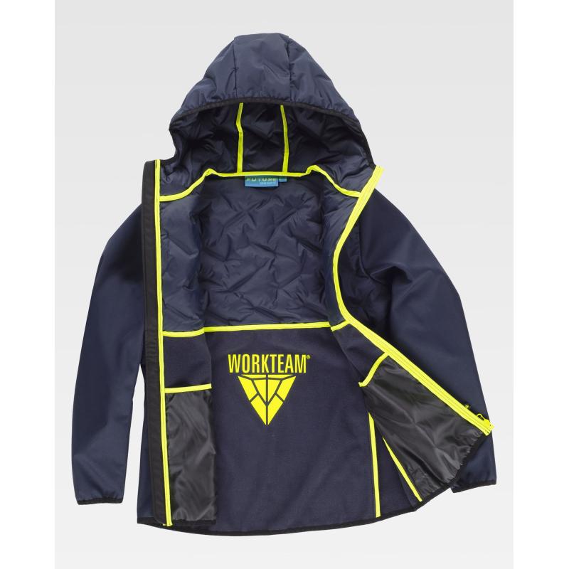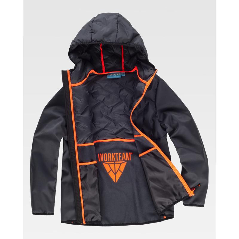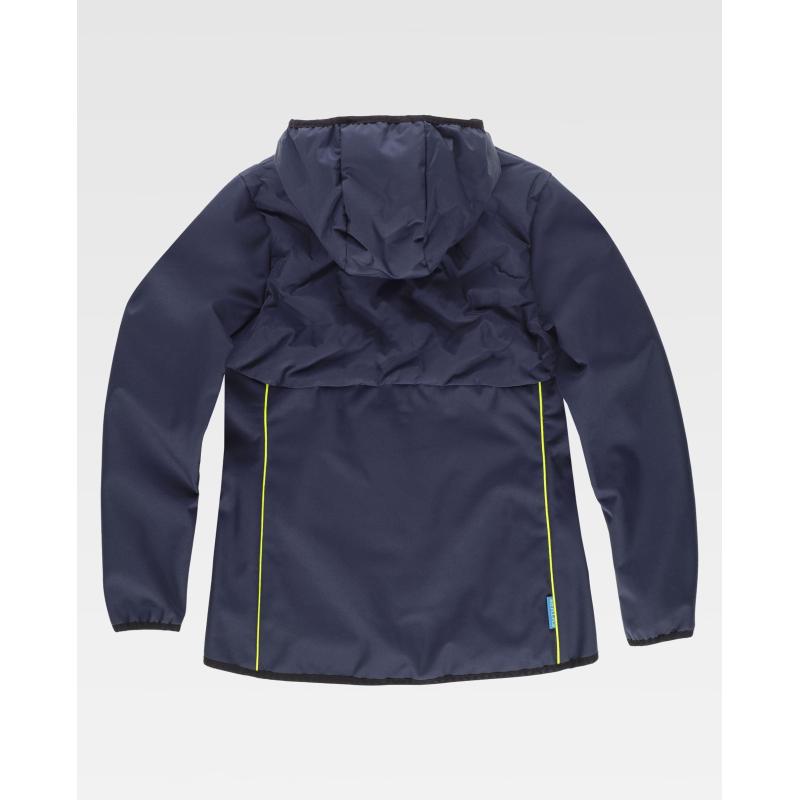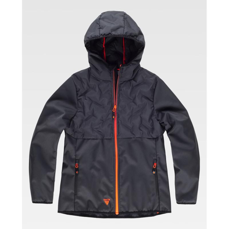Workshell acolchada de mujer combinada. Capucha con cierre de cremallera de nylon. Solapa protectora interior vuelta en la parte superior cubriendo la cremallera. Dos bolsos laterales interiores con cierre de cremallera de nylon. Capucha, puños y bajo ribeteados con bies elástico personalizado. 100% Poliéster