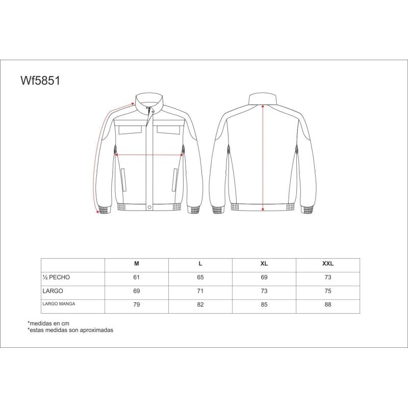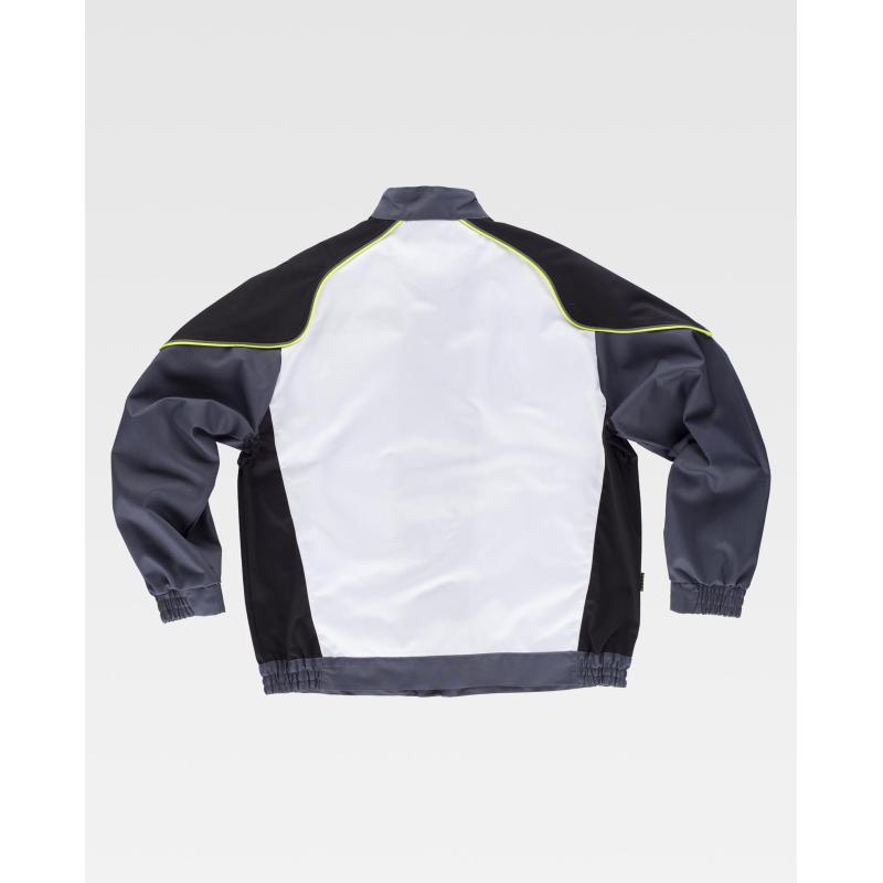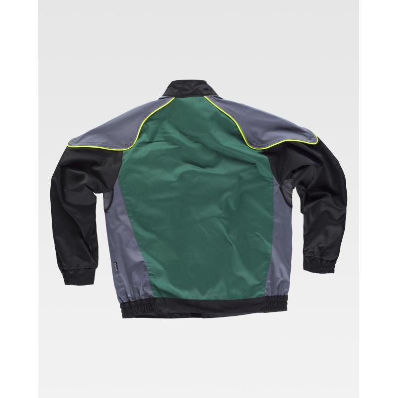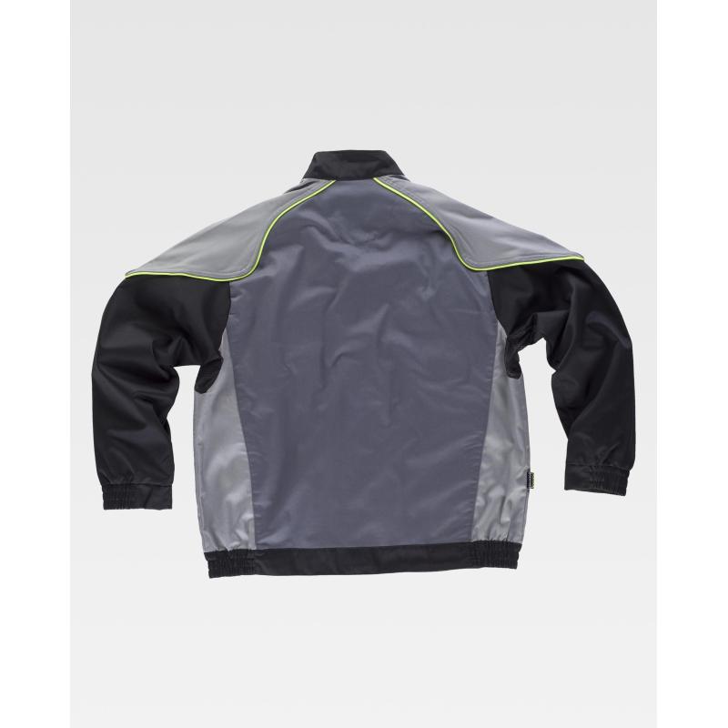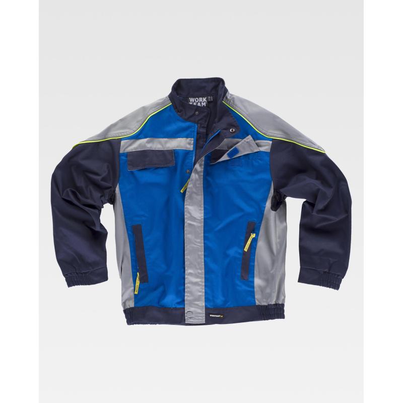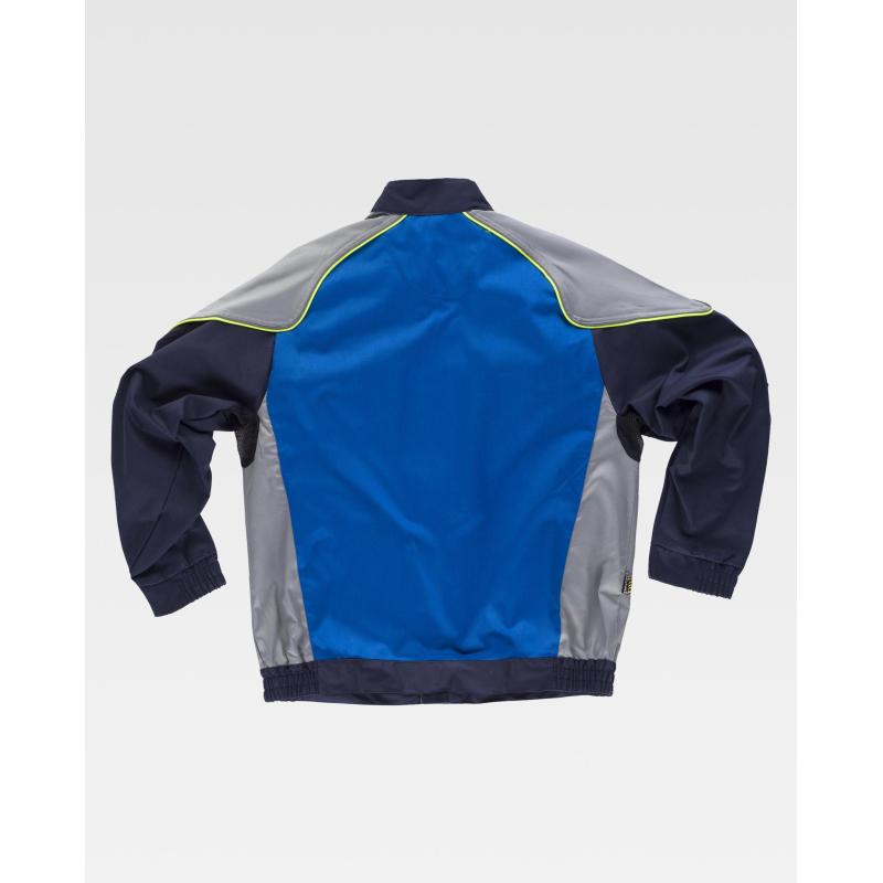 Cazadora tricolor con vivos de alta visibilidad. Cuello alto con corchete y cierre de cremallera y corchetes ocultos por solapa postiza. Rejilla para regular la transpiración en axilas. Dos bolsos de pecho interiores con cartera de velcro. Dos bolsos laterales interiores con cremallera. Pieza combinada en hombros rematada con doble vivo. Puño con elástico. Elástico en los laterales de la cintura. Corchete en cinturilla. 65% Poliéster 35% Algodón