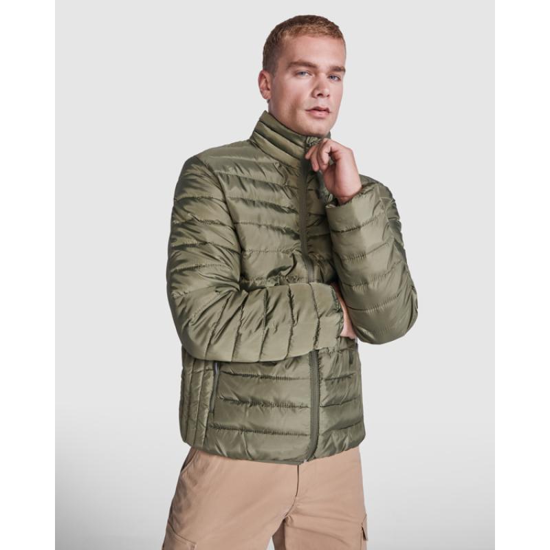 Chaqueta acolchada resistente al agua. Cremallera frontal invertida al tono con protector de barbilla del mismo tejido. Bolsillos laterales con cremalleras invertidas al tono insertado en los paneles laterales. Vivo elástico al tono en puños y bajo. Opción de colores lisos o a contraste en interior.