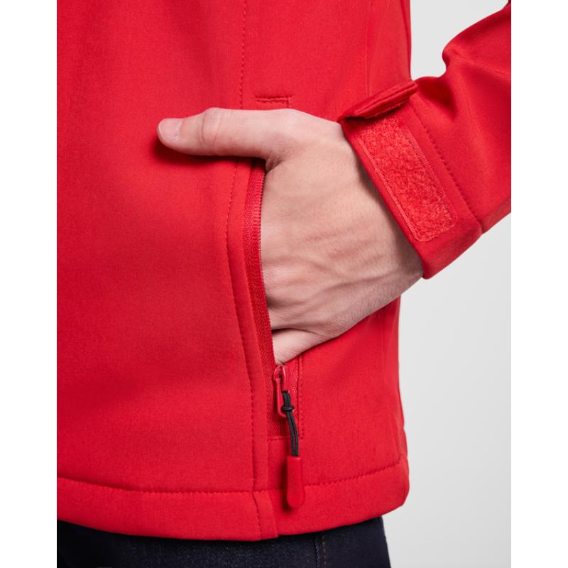 Chaqueta softshell de 2 capas con cremallera frontal invertida. Interior en tejido micropolar. Dos bolsillos laterales y uno en pecho derecho con cremalleras invertidas. Protector de barbilla del mismo tejido invertido. Ajustadores laterales en el interior en tallas de adulto.