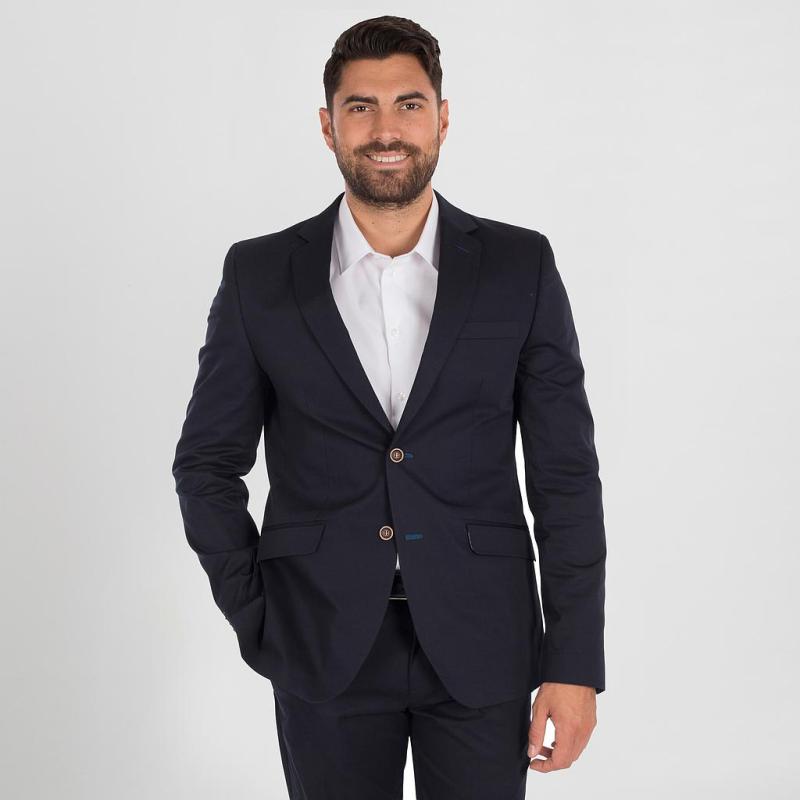 - 2 botones en delantero- Pinzas en el delantero- 2 bolsillos laterales con cartera y vivo- 1 bolsillo pecho de vivo- 3 bolsillos interiores- 2 aberturas espalda- Costura centro espalda- Largo aprox.: 73cm- Prenda H1: ajustada