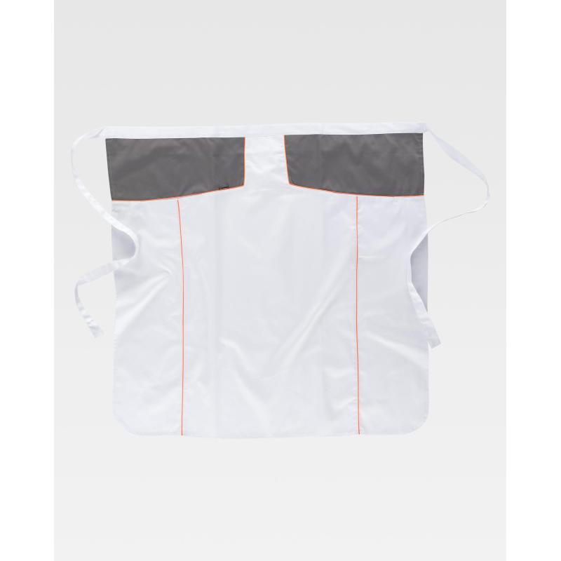 Delantal francés extralargo combinado. Dos bolsos laterales de abertura inclinada y cortes decorativos rematados con vivos de alta visibilidad. Tiras para ajustar en la cintura. Acabado antimanchas. 85X90 cm. 65% Poliéster 35% Algodón