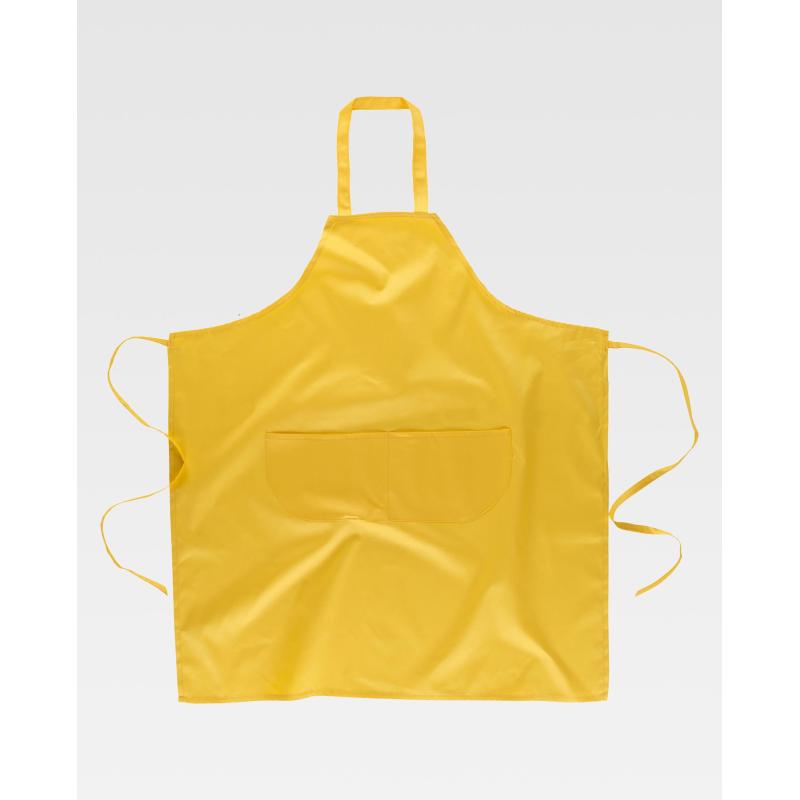Delantal con peto. Un bolso redondeado central compartimentado. Cinta de cuello fija. Tiras para ajustar en la cintura. Colores a elegir. Fabricación especial. 95X90 cm. 65% Poliéster 35% Algodón