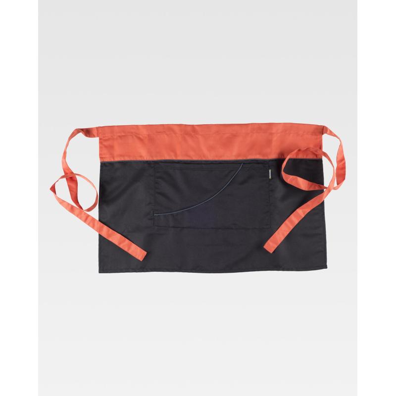 Delantal francés corto con parte superior y cintura combinada. Un bolso central con corte de fantasía rematado con vivo. Tiras para ajustar en la cintura. 70X45 cm. 85% Poliéster 15% Viscosa