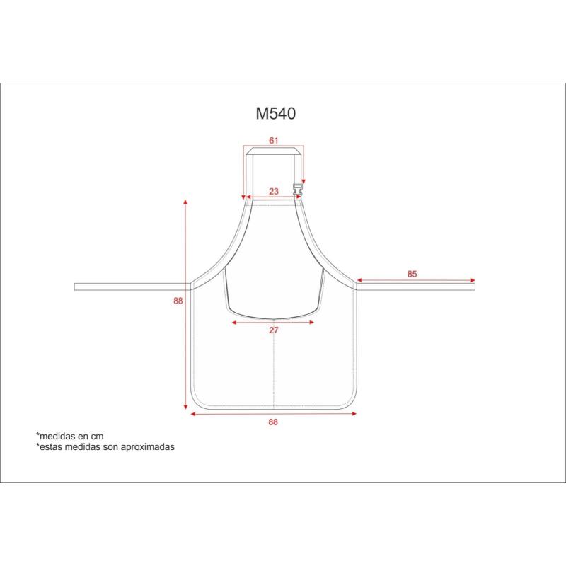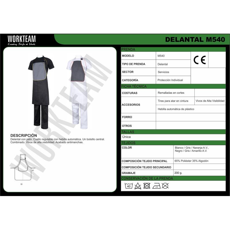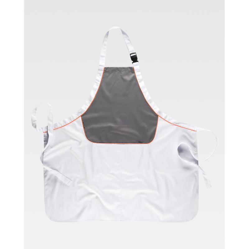 Delantal combinado con peto. Un bolso central y corte decorativo rematado con vivos de alta visibilidad. Cuello con hebilla regulable. Tiras para ajustar en la cintura. Acabado antimanchas. 90X90 cm. 65% Poliéster 35% Algodón