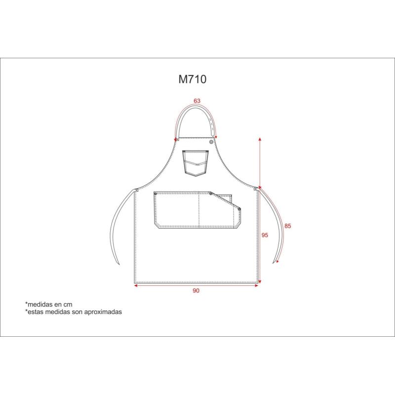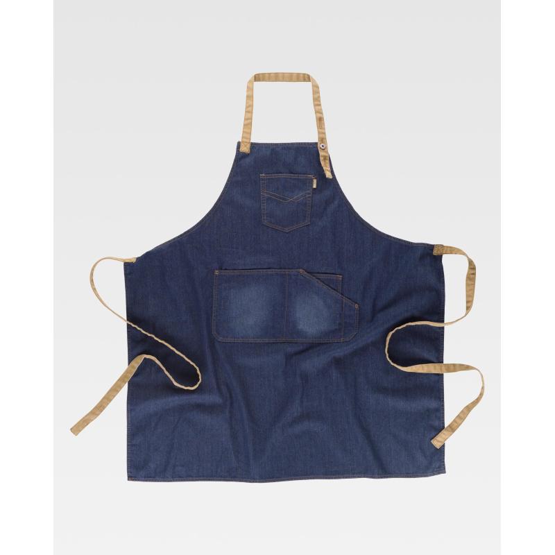 Delantal con peto en tejido vaquero. Un bolso de pecho con costuras de fantasía y un bolso central de corte asimétrico compartimentado con bolsillo relojero interior. Cinta de loneta regulable con botones metálicos en el cuello, y cintas para ajustar en la cintura. Diseño contemporáneo con acabado desgastado, pespuntes a contraste en tono ocre y remaches de cobre. 65% Algodón 35% Poliéster