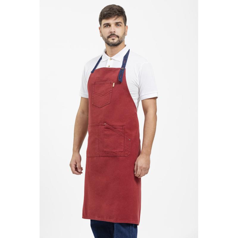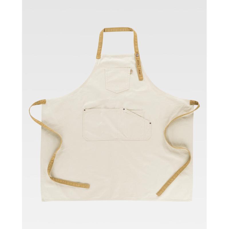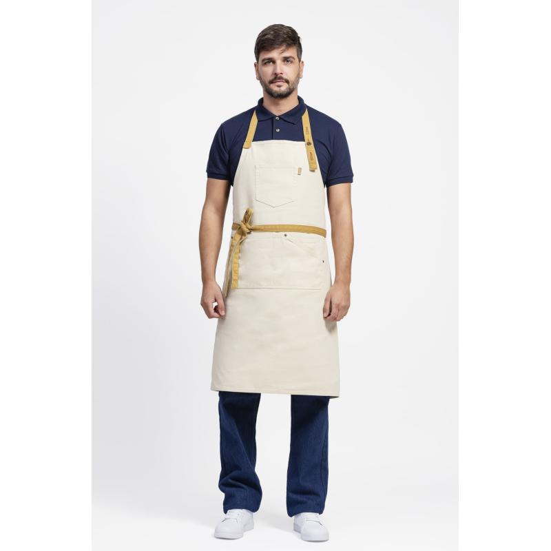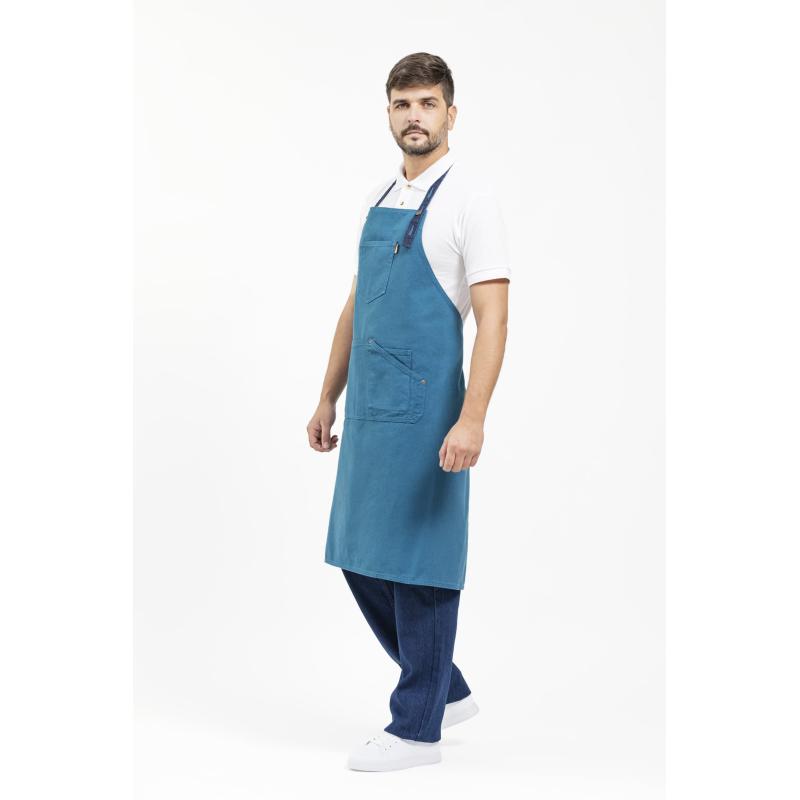 Delantal con peto en tejido canvas. Un bolso de pecho con costuras de fantasía y un bolso central de corte asimétrico compartimentado con bolsillo relojero interior. Cinta de tejido vaquero regulable con botones metálicos en el cuello y cintas para ajustar en la cintura. Diseño contemporáneo con remaches de cobre. 100% Algodón