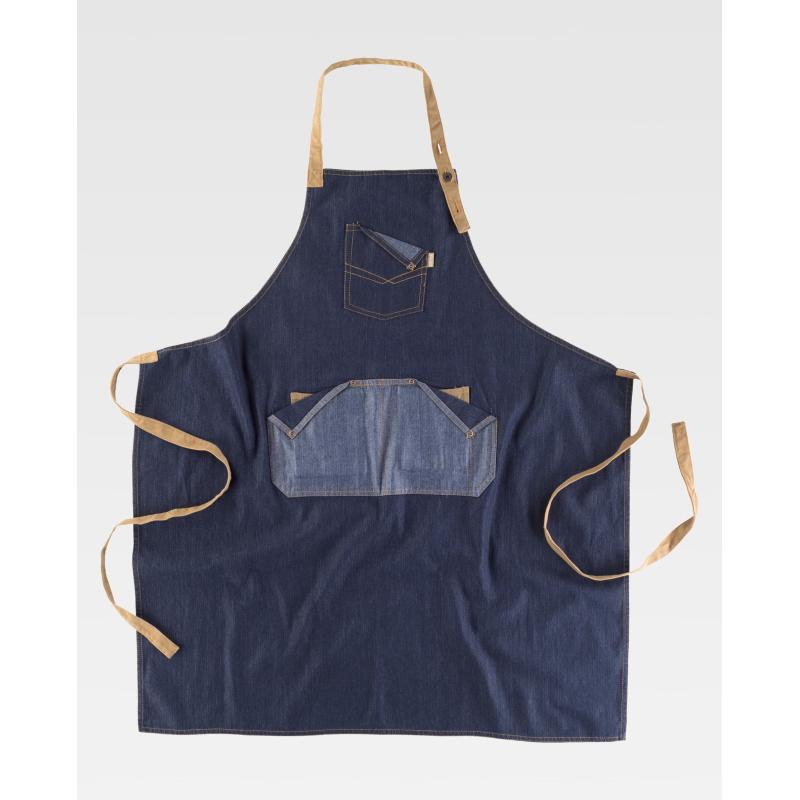Delantal con peto en tejido vaquero combinado con canvas. Un bolso de pecho con costuras de fantasía y un bolso central de corte simétrico compartimentado con dos bolsillos relojeros interiores. Cinta de tejido canvas regulable con botones metálicos en el cuello y cintas para ajustar en la cintura. Diseño contemporáneo con remaches de cobre. Prin. 65% Poliéster 35% Algodón / Sec. 100% Algodón