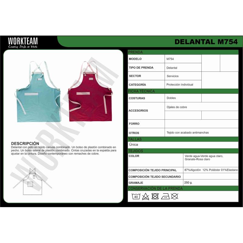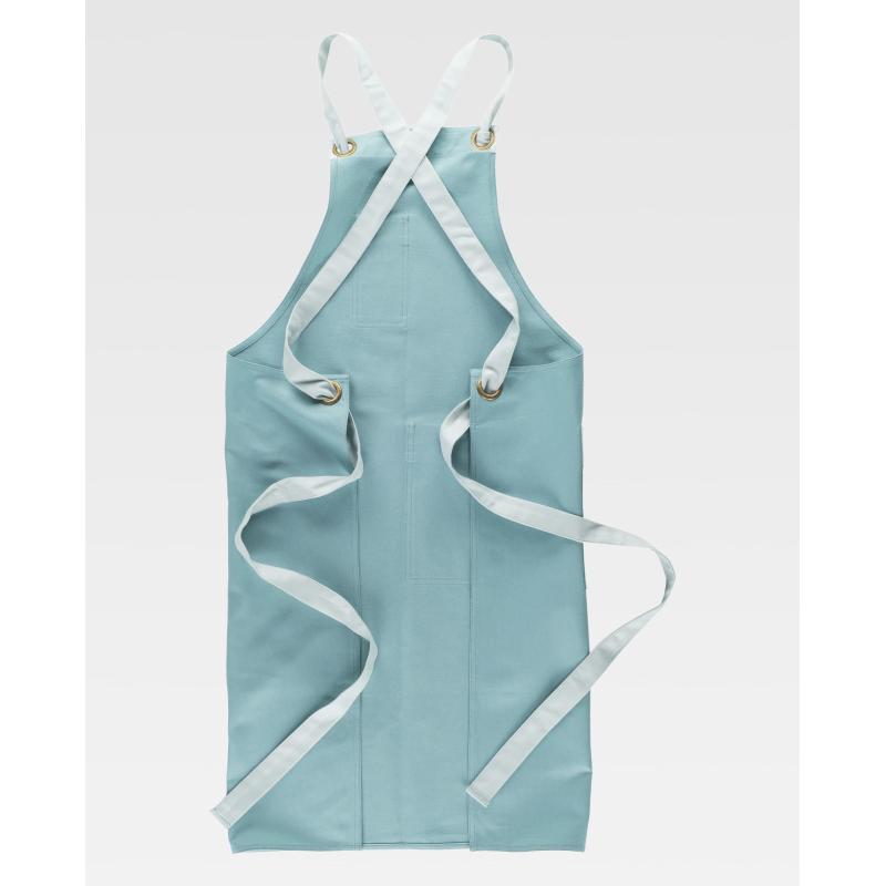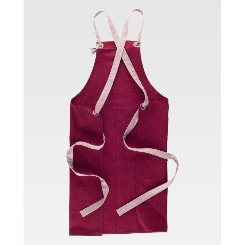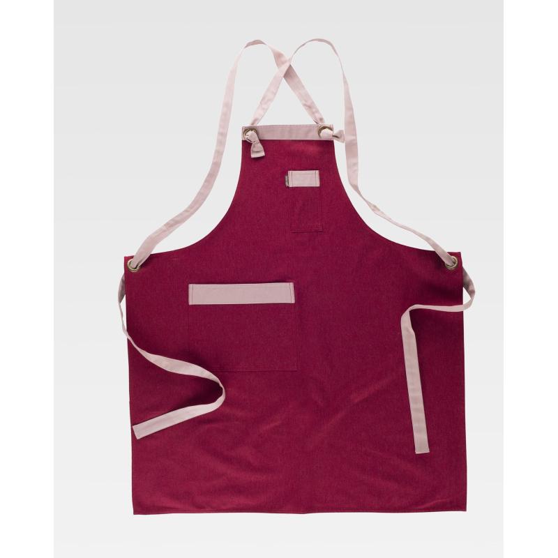 Delantal con peto en tejido canvas combinado. Un bolso de plastón combinado en pecho. Un bolso lateral de plastón combinado. Cintas cruzadas en la espalda para ajustar en la cintura. Diseño contemporáneo con remaches de cobre. 87% Algodón 12% Poliéster 1% Elastano