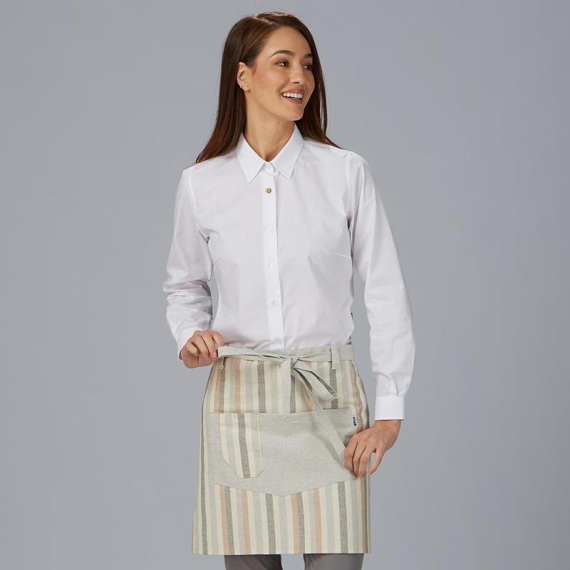 * Diseño moderno con estampado de rayas, en color gris claro. * Confeccionado en loneta de alta resistencia, que garantiza durabilidad y confort. * Formato corto de 45 cm, ideal para mayor movilidad en el trabajo. * Sistema de ajuste mediante cinta, adaptable a distintas siluetas. * Doble bolsillo frontal, para máxima funcionalidad y almacenamiento. * Perfecto para hostelería, restauración y comercios con un toque elegante.
