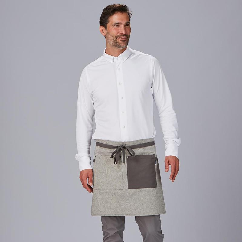 * Diseño moderno y versátil, disponible en gris y camel. * Fabricado en loneta resistente, ideal para el uso diario. * Tamaño corto de 45 cm, que facilita el movimiento. * Cinta ajustable, para un ajuste personalizado. * Dos bolsillos delanteros, para máxima funcionalidad. * Ideal para hostelería, comercios y profesionales que buscan comodidad y estilo.