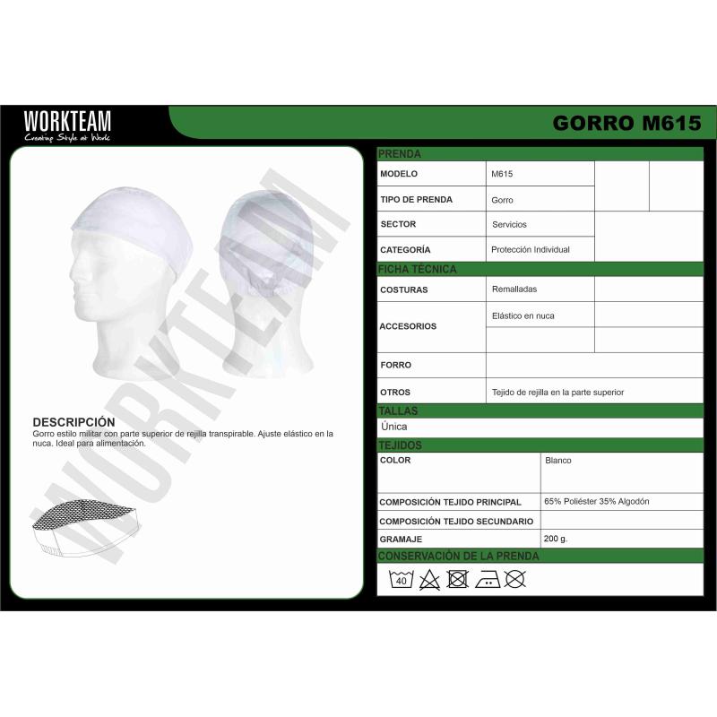 Gorro estilo militar con parte superior de rejilla transpirable. Ajuste elástico en la nuca. Ideal para alimentación. 65% Poliéster 35% Algodón