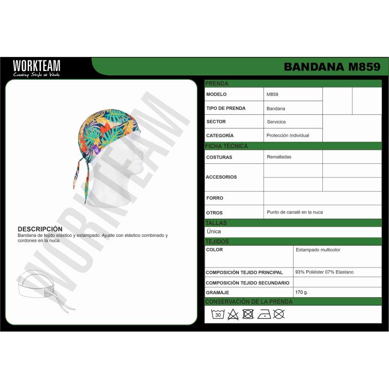 Bandana de tejido elástico y estampado. Ajuste con elástico combinado y cordones en la nuca. 93% Poliéster 7% Elastano