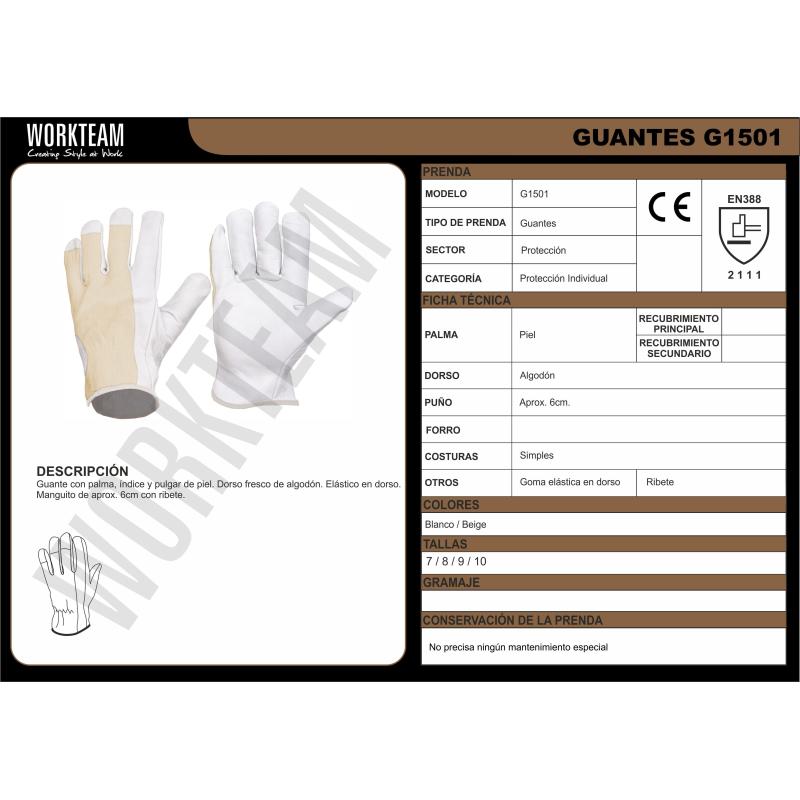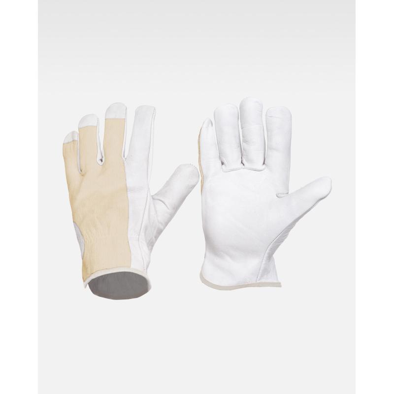Guante con palma en piel y dorso en algodón. Puño elástico. Color blanco. Piel / Algodón