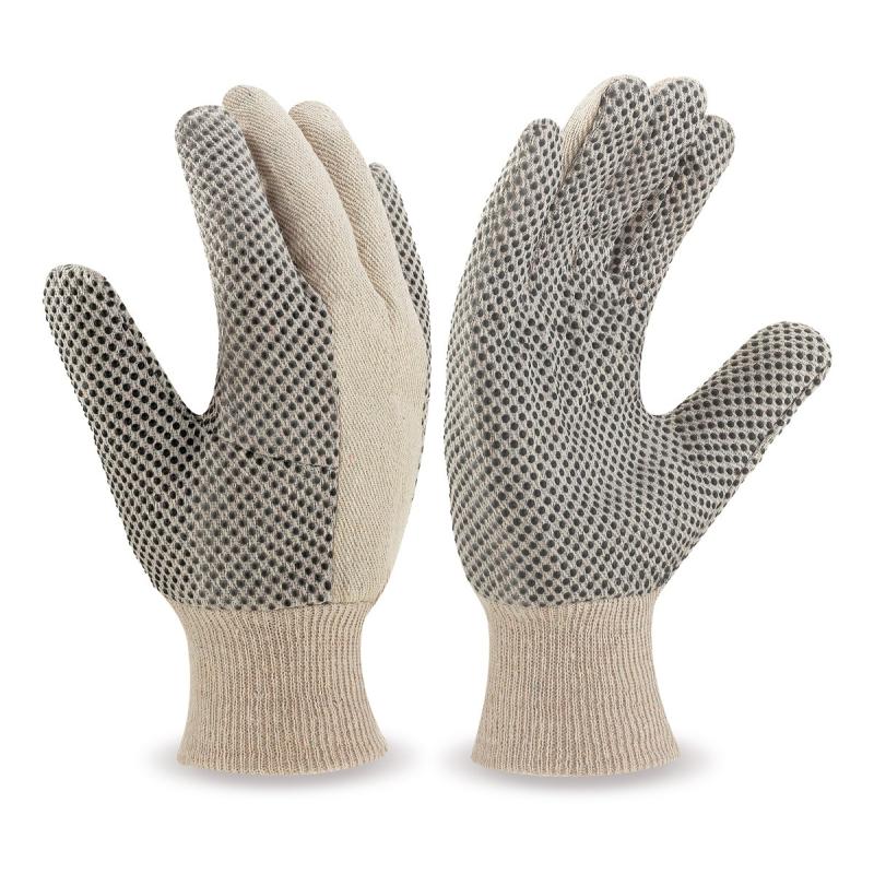 Características y ventajas: - Guante de lona (tejido muy apretado y cilindrado) de algodón 100%, con puntos de PVC en palma y dedos con cierre de puño elástico.