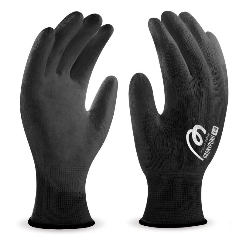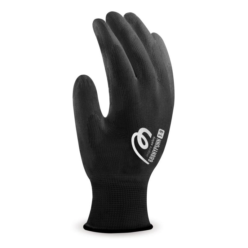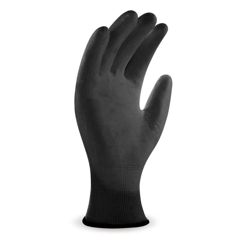 Guante de base textil de poliéster sin costuras con recubrimiento de poliuretano en palma y dedos e hilo elástico en muñeca para aumentar el ajuste.