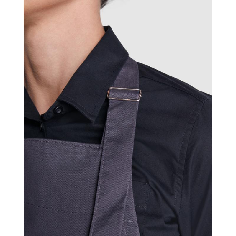Delantal largo sarga reciclado.· Acabado piel de melocotón.· Cinta del mismo tejido en cuello con ajustador metálico.· Cintas del mismo tejido para ajustar en la cintura.· Bolsillo frontal con doble costura central que divide el bolsillo en dos.· Certificado GRS.