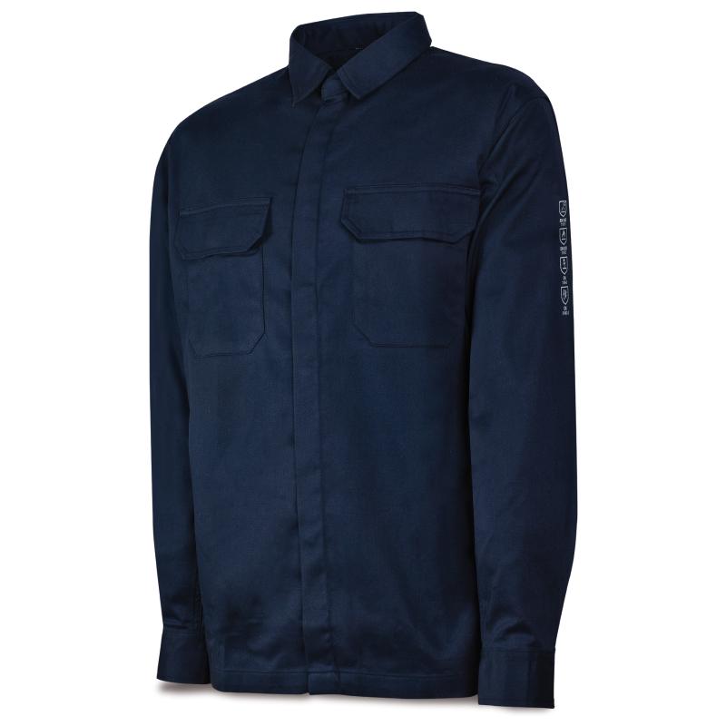 Camisa ignífuga y antiestática con protección contra calor y llama, y los efectos térmicos del arco eléctrico. Cierre frontal por botones con tapeta frontal. 2 bolsillos en pecho con tapeta y cierre por botón. Tejido muy ligero que aumenta el confort y reduce el stress térmico.COMPOSICIÓN:98% algodón (tratado) + 2% fibra antiestática.Costuras con hilo de meta-aramida.