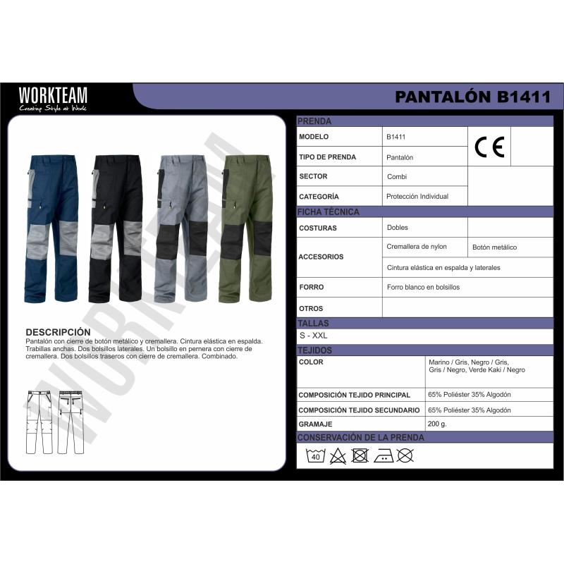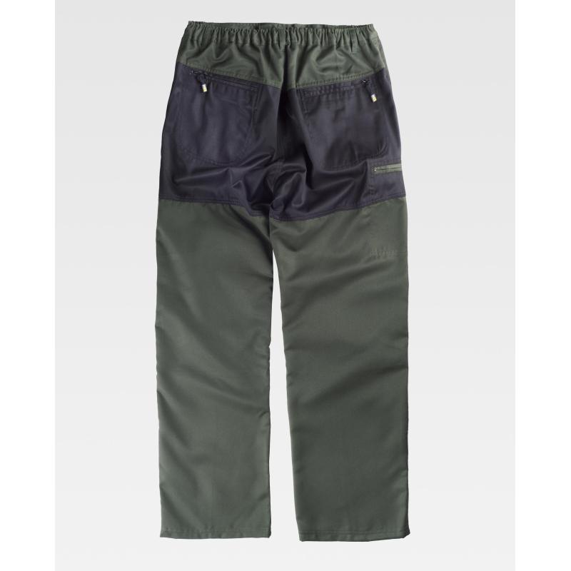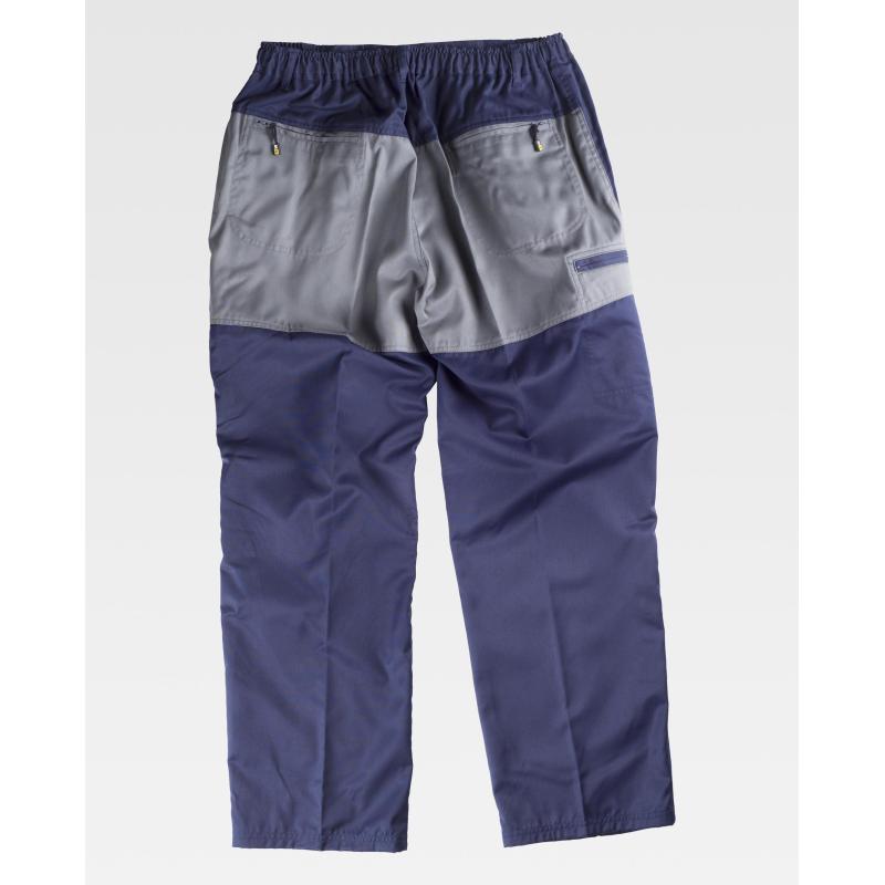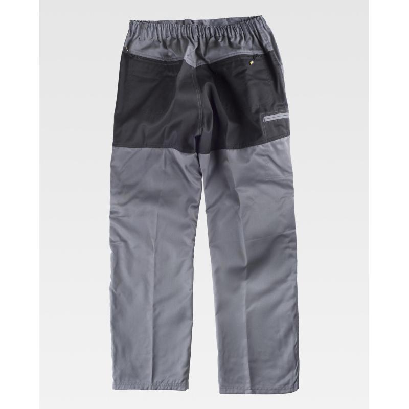 Pantalón combinado. Dos bolsos de ojal de abertura inclinada en los costados. Un bolso lateral interior con cierre de cremallera. Dos bolsos traseros interiores con cremallera en la culera. Rodilleras y culera a contraste. Elástico en cintura. Trabillas de distinto tamaño. Cierre de botón metálico y bragueta de cremallera. 65% Poliéster 35% Algodón