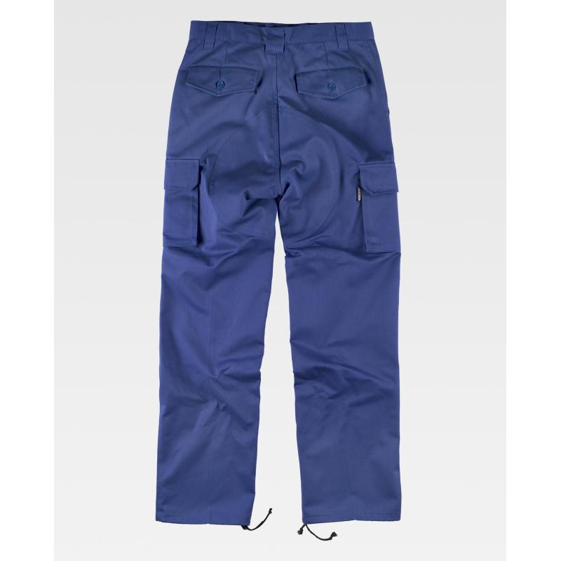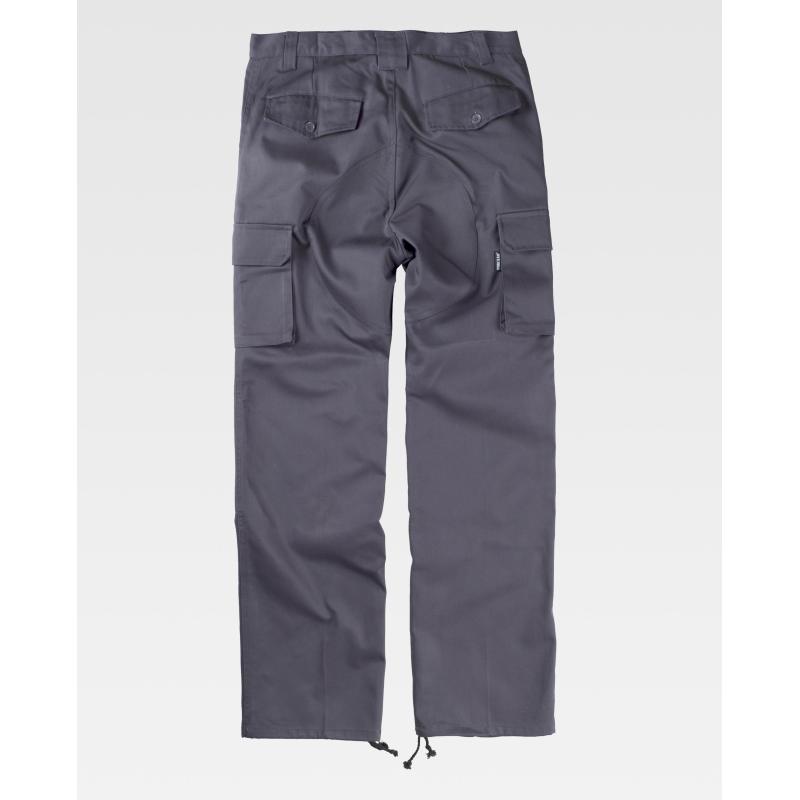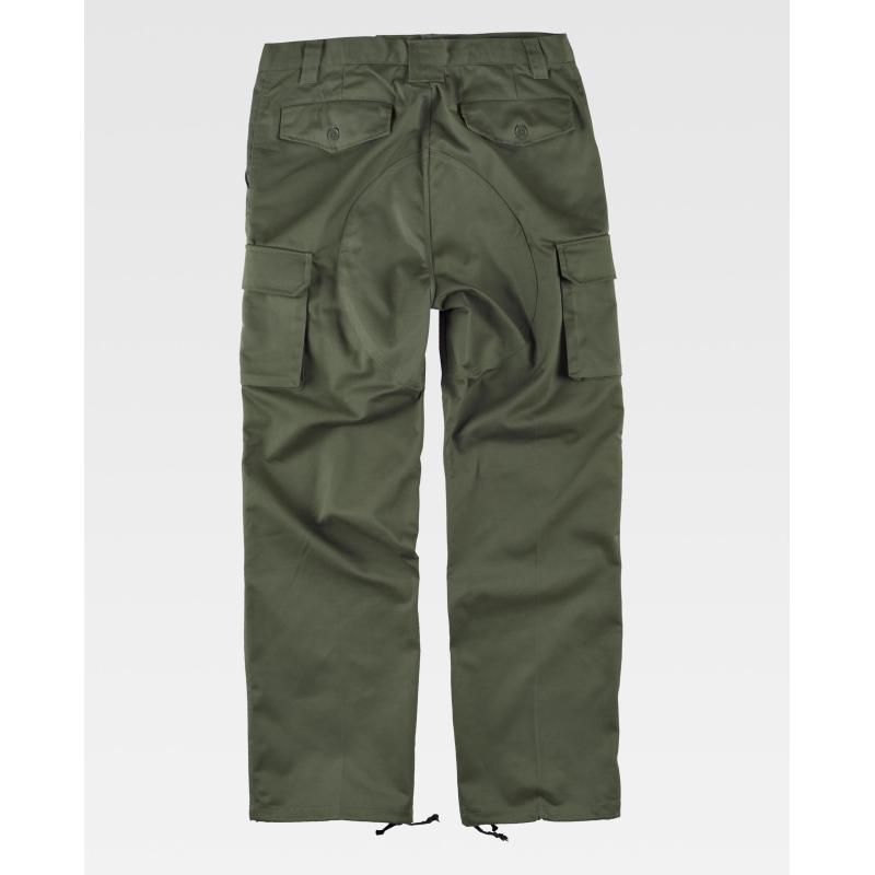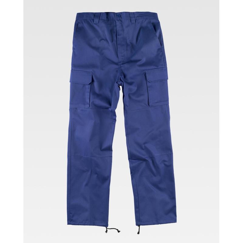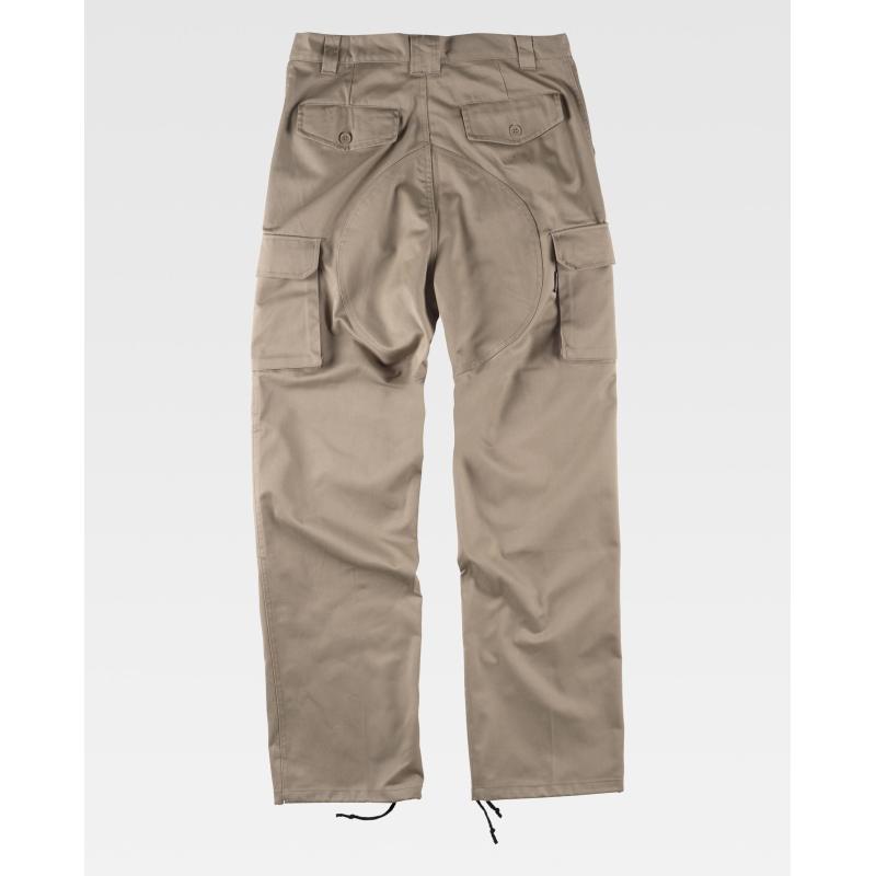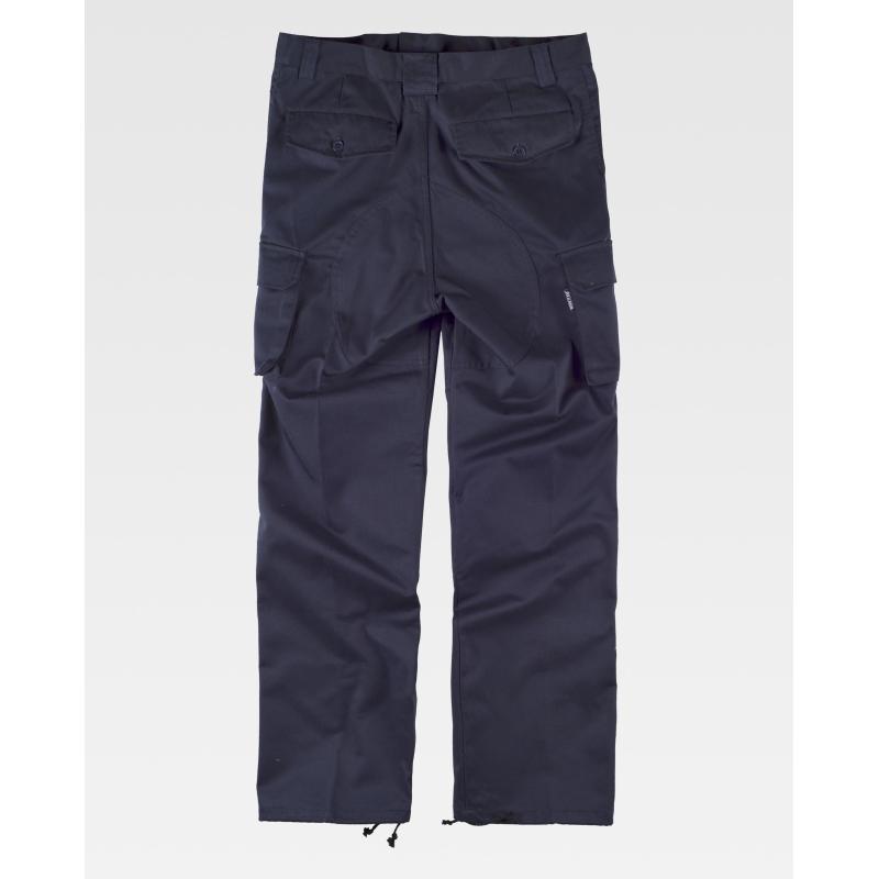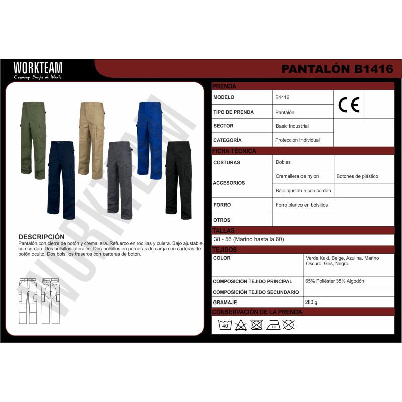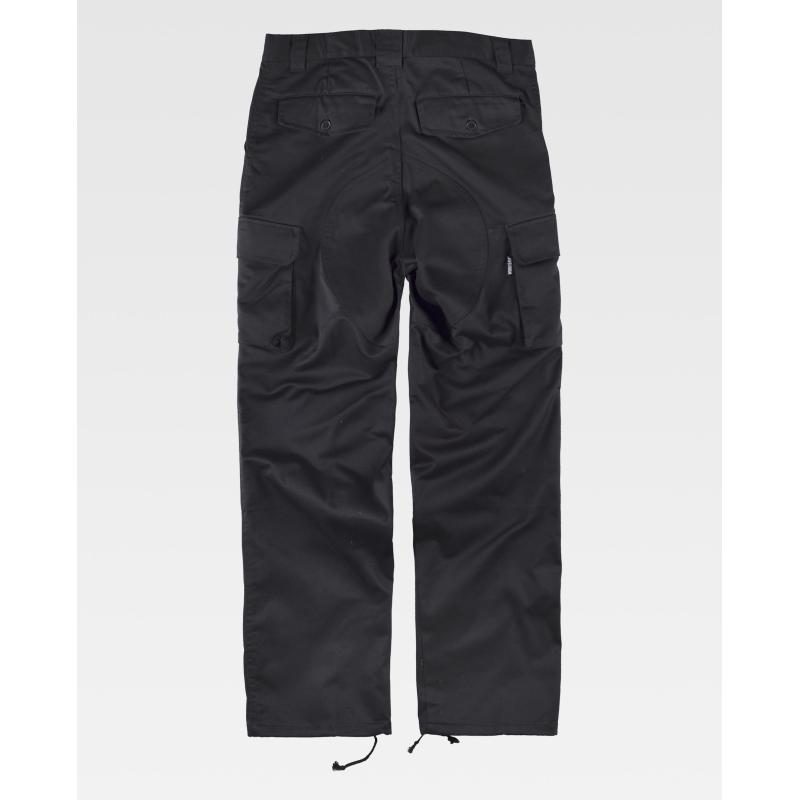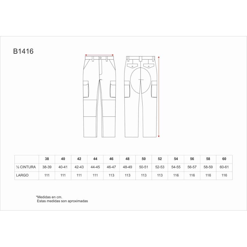 Pantalón con refuerzos. Dos bolsos de abertura inclinada en los costados, dos bolsos laterales de carga con cartera de botón oculto. Dos bolsos traseros interiores con cartera de pico y botón. Culera y rodilleras reforzadas. Bajos ajustables con cordón. Sin elástico en cintura. Trabillas. Cierre de botón y bragueta de cremallera. 65% Poliéster 35% Algodón
