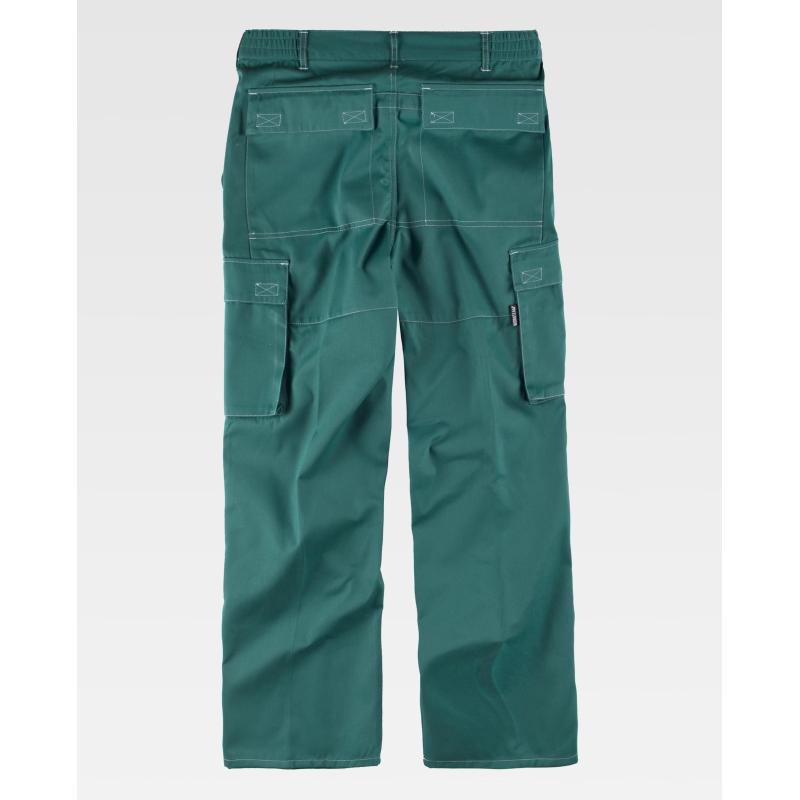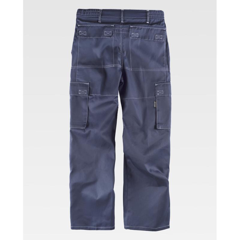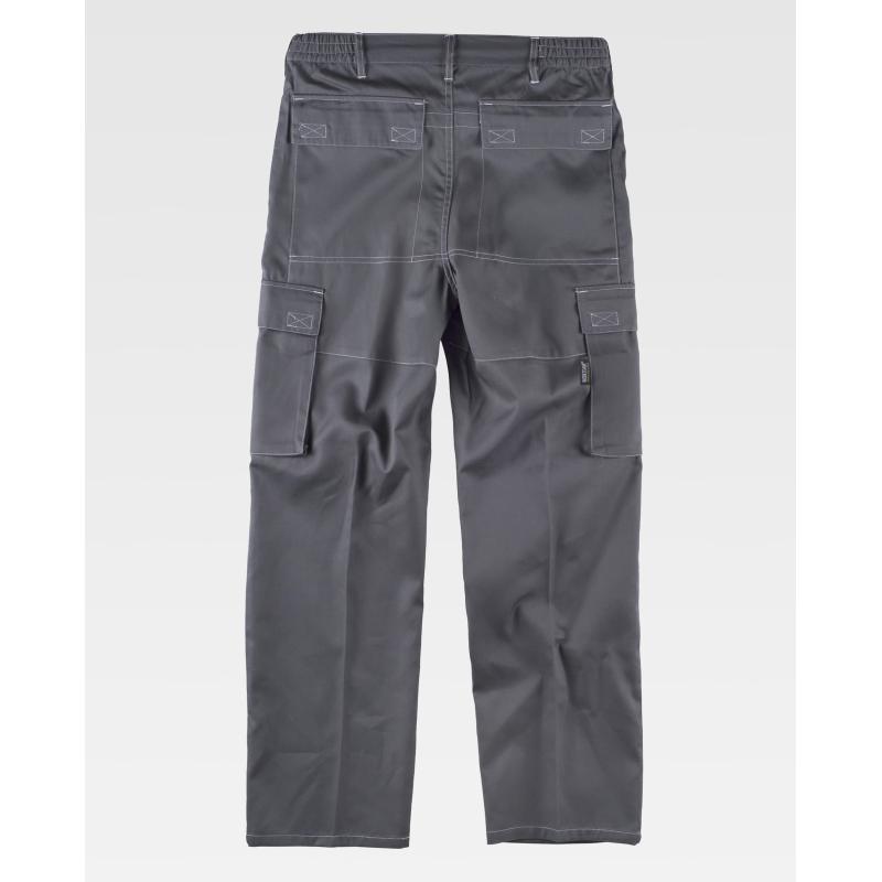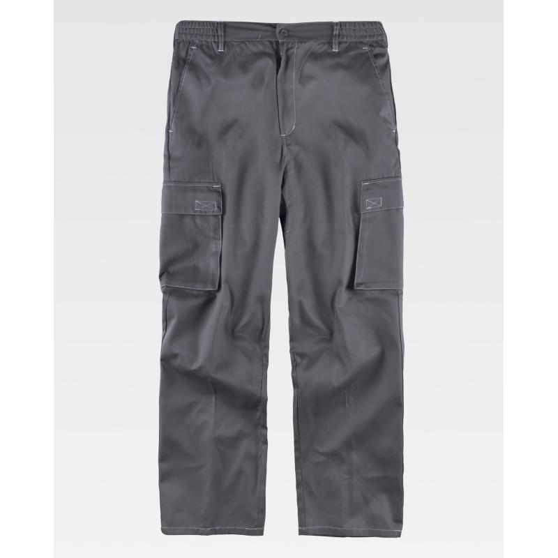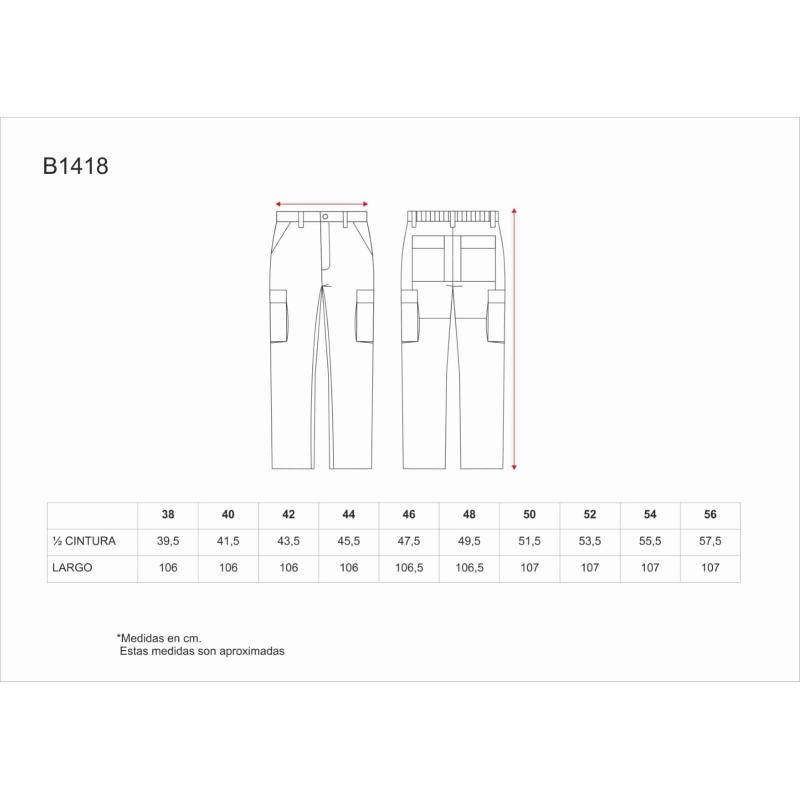 Pantalón con costuras a contraste. Dos bolsos de abertura inclinada en los costados, dos bolsos laterales de carga con cartera de velcro. Dos bolsos en el refuerzo de la culera con cartera de velcro. Elástico en los laterales de la cintura. Trabillas. Cierre de botón y bragueta de cremallera. 65% Poliéster 35% Algodón