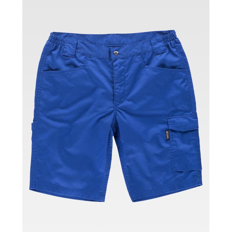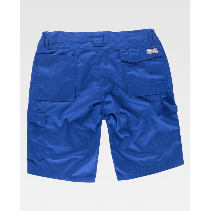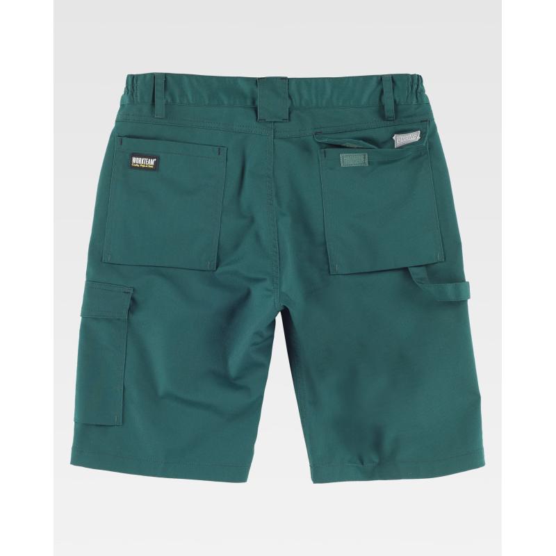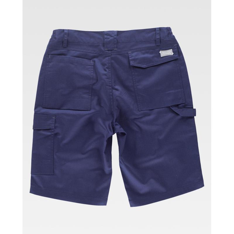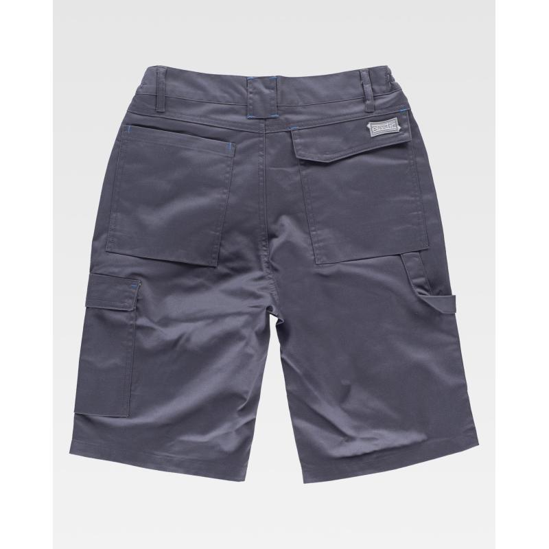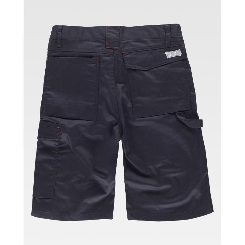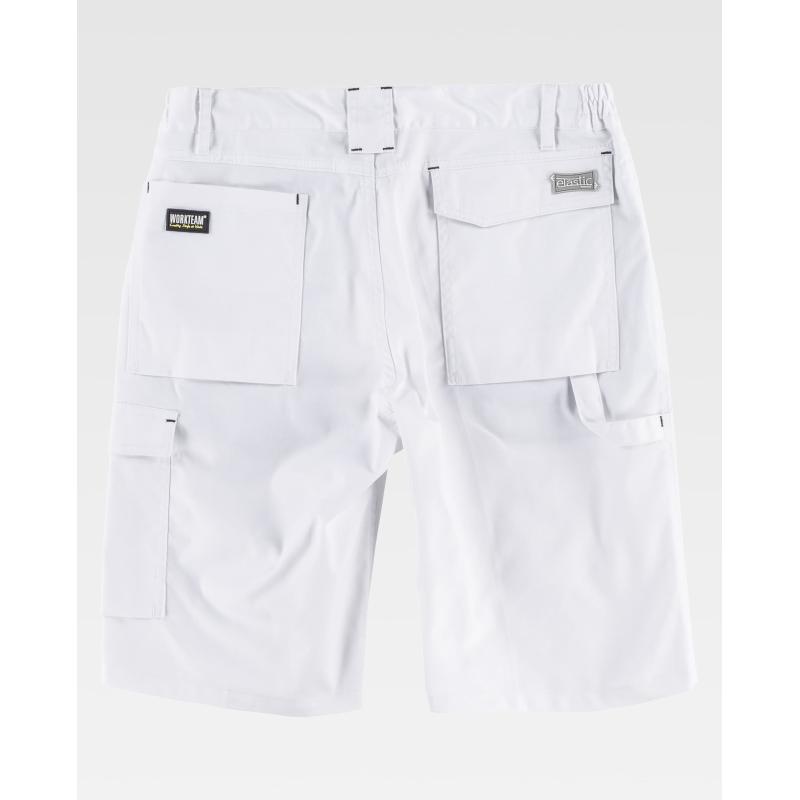 Bermuda de tejido elástico bidireccional por construcción. Dos bolsos de abertura inclinada en los costados y un bolso lateral con pliegue inferior y cartera de velcro. Dos bolsos traseros con pliegue inferior, uno con cartera de velcro y un bolso de espátula. Trabilla porta martillo. Presillas a contraste. Elástico en los laterales de la cintura. Trabillas de diferente tamaño. Cierre de botón metálico y bragueta de cremallera. 65% Poliéster 35% Algodón