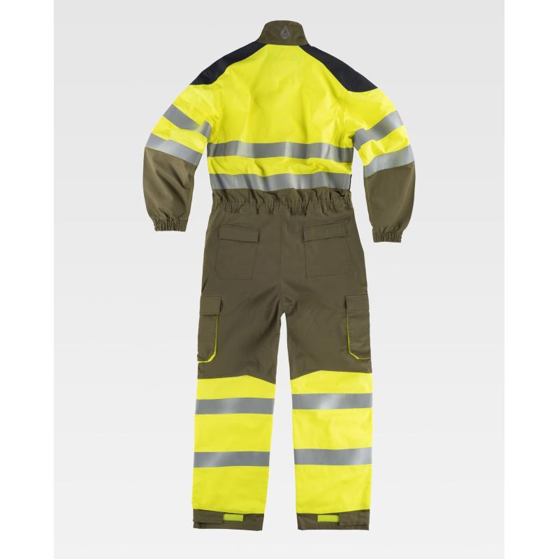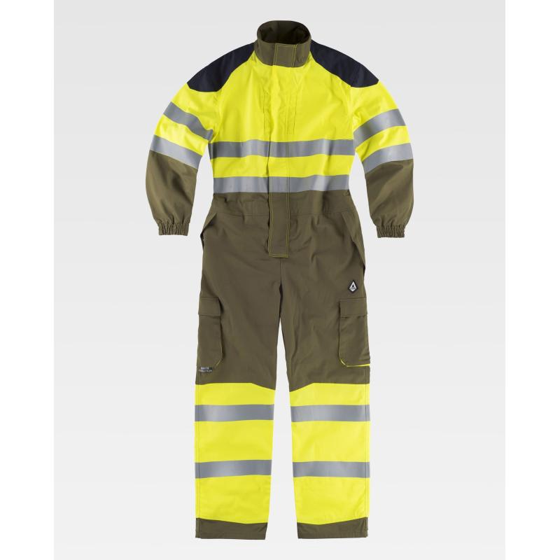 Buzo tricolor ignífugo y antiestático de alta visibilidad, con cintas reflectantes y tejido Ripstop. Cuello alto y cierre de cremallera de metal de doble tirador y velcro oculto por solapa postiza. Dos bolsos de pecho de ojal con solapa de seguridad y corchete oculto. Dos bolsos laterales de carga con cartera de velcro. Dos bolsos traseros de plastón con solapa de seguridad y corchete oculto. Refuerzo en hombros. Dos cintas reflectantes termoselladas ignífugas en pecho, espalda, mangas y perneras. Puño con elástico. Elástico en la espalda. Bajos ajustables con velcro. 75% Algodón 24% Poliéster 1% Fibra Antiestática