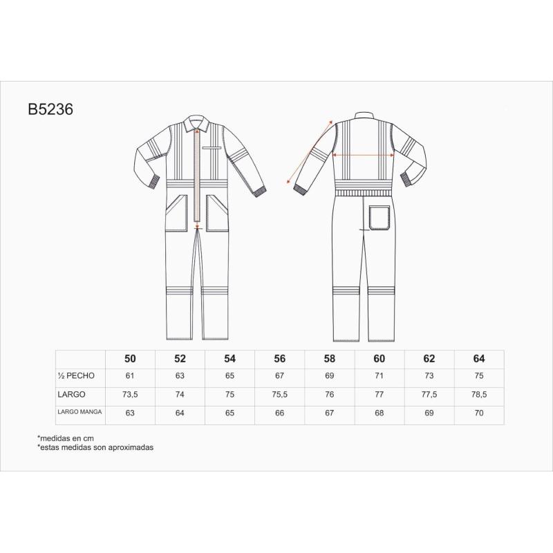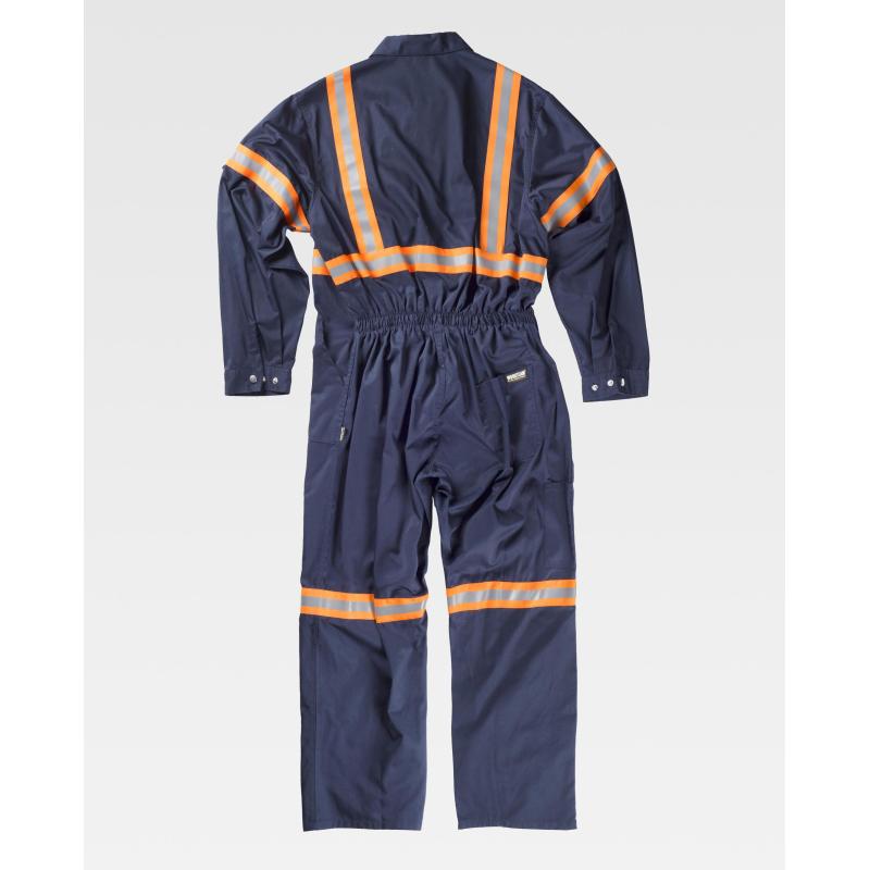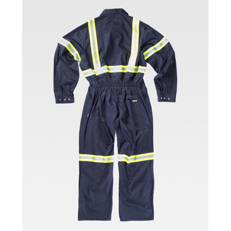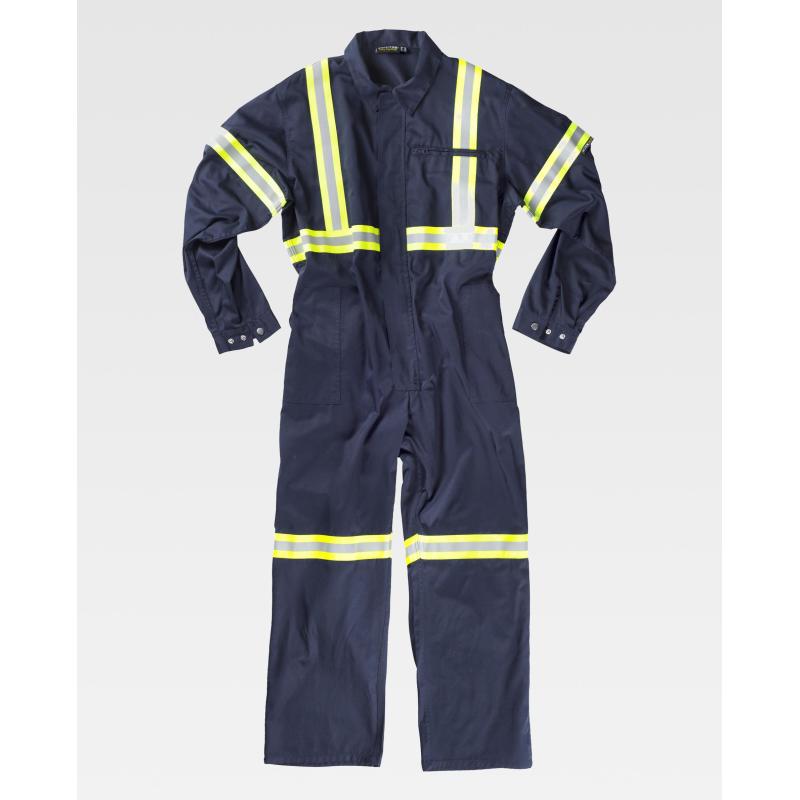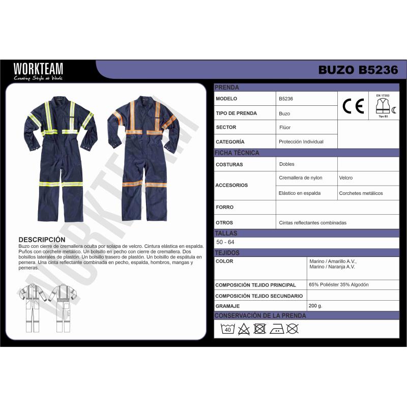 Buzo con cintas reflectante-fluorescentes. Cuello camisero y cierre de cremallera de nylon de doble tirador oculta por solapa postiza con velcro. Un bolso de pecho interior con cremallera de nylon, dos bolsos de plastón de abertura inclinada en los costados. Un bolso trasero de plastón y un bolso de espátula. Una banda fluorescente con una cinta reflectante en pecho, espalda, hombros, mangas y perneras. Puño con corchete metálico. Elástico en la espalda. 65% Poliéster 35% Algodón