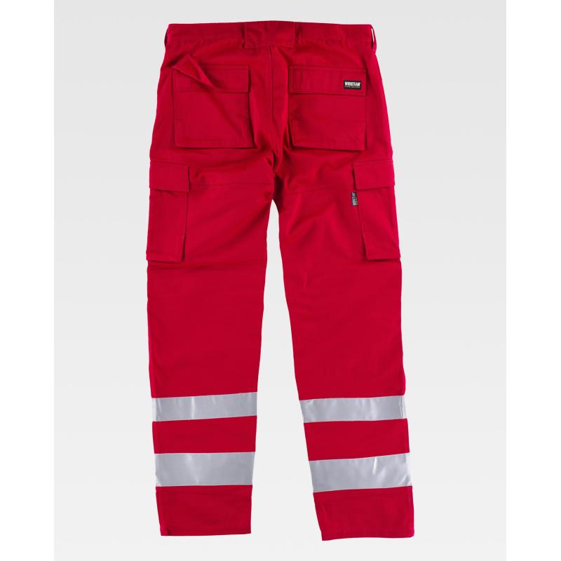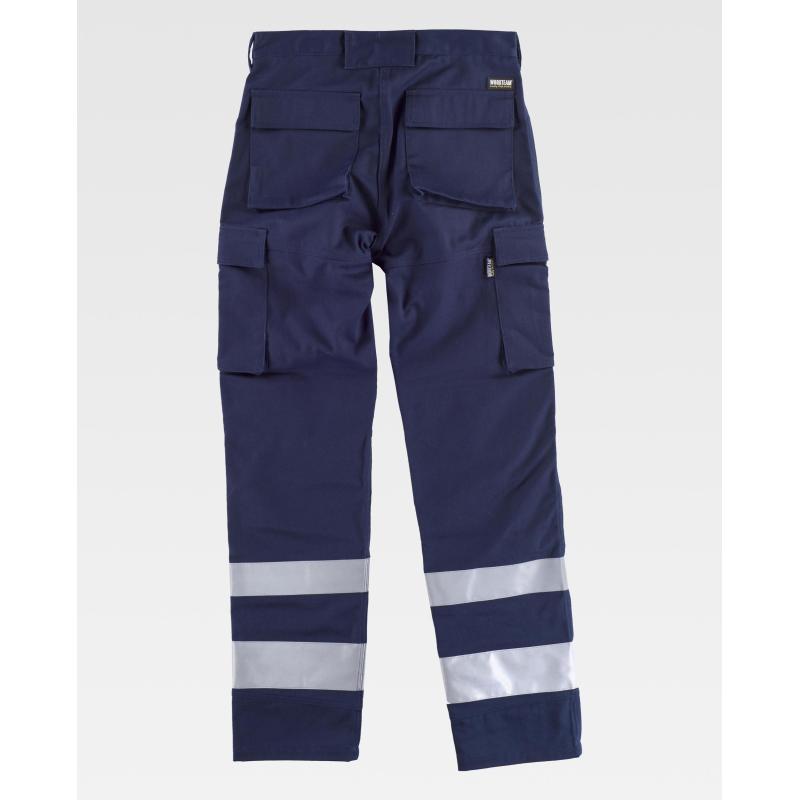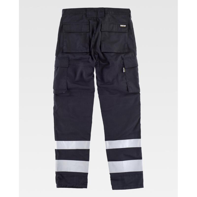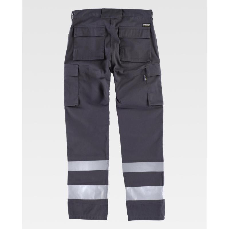 Pantalón de triple costura con cintas reflectantes. Dos bolsos de fuelle con abertura inclinada en los costados, un bolsillo relojero, dos bolsos laterales de carga con fuelle inferior y cartera de velcro. Dos bolsos traseros con fuelle inferior y cartera de velcro. Refuerzo con cartera de velcro para rodilleras de protección. Dos cintas reflectantes de distinto tamaño en perneras. Cintura con ajustes laterales de velcro. Trabillas. Argolla. Cierre de botón metálico y bragueta de cremallera. 65% Poliéster 35% Algodón