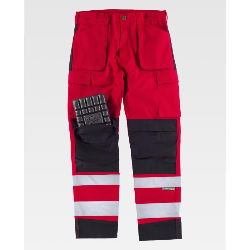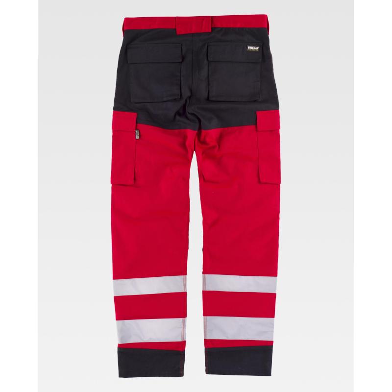 Pantalón combinado de triple costura y con cintas reflectantes. Dos bolsos de fuelle con abertura inclinada en los costados, un bolsillo relojero, dos bolsos laterales de carga con cartera de velcro. Dos bolsos traseros con fuelle inferior y cartera de velcro. Refuerzo con cierre de velcro para rodilleras de protección. Dos cintas reflectantes de distinto tamaño en perneras. Cintura con ajustes laterales de velcro. Trabillas. Argolla metálica. Cierre de botón metálico y bragueta de cremallera. 65% Poliéster 35% Algodón