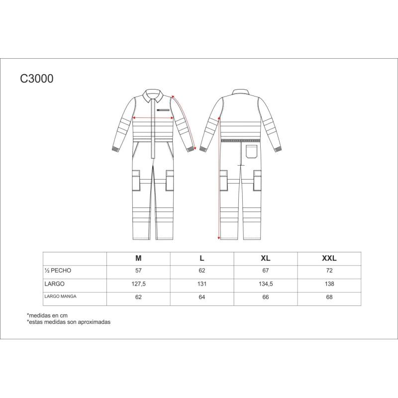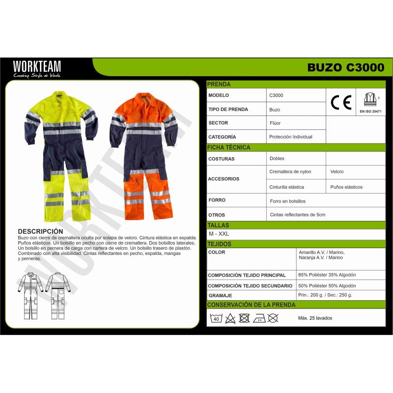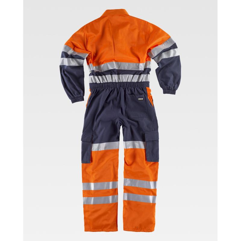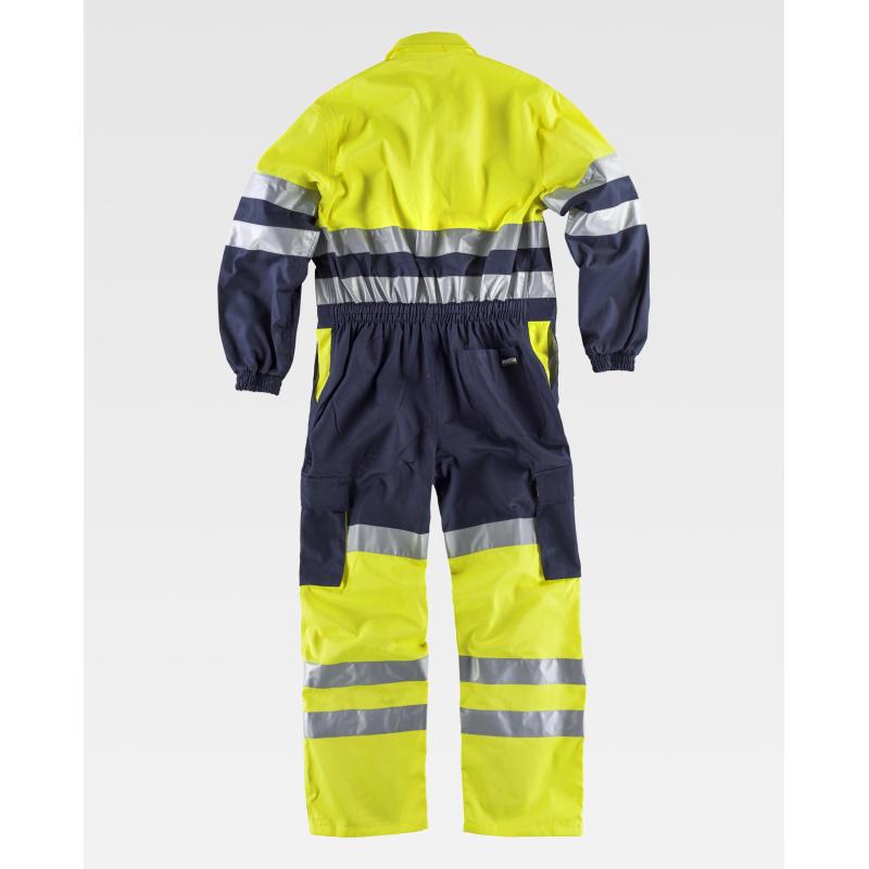 Buzo combinado con alta visibilidad y cintas reflectantes. Cuello camisero y cierre de cremallera de nylon de doble tirador oculta por solapa de velcro. Un bolso de pecho interior con cierre de cremallera, dos bolsos laterales de abertura inclinada, dos bolsos laterales de carga con fuelle y cartera de velcro. Un bolso trasero de plastón. Cintas reflectantes en pecho, espalda, mangas y perneras. Parte superior, inferior y vistas de bolsos de alta visibilidad. Puño elástico. Elástico en la espalda. Prin. 65% Poliéster 35% Algodón / A.V. 50% Poliéster 50% Algodón