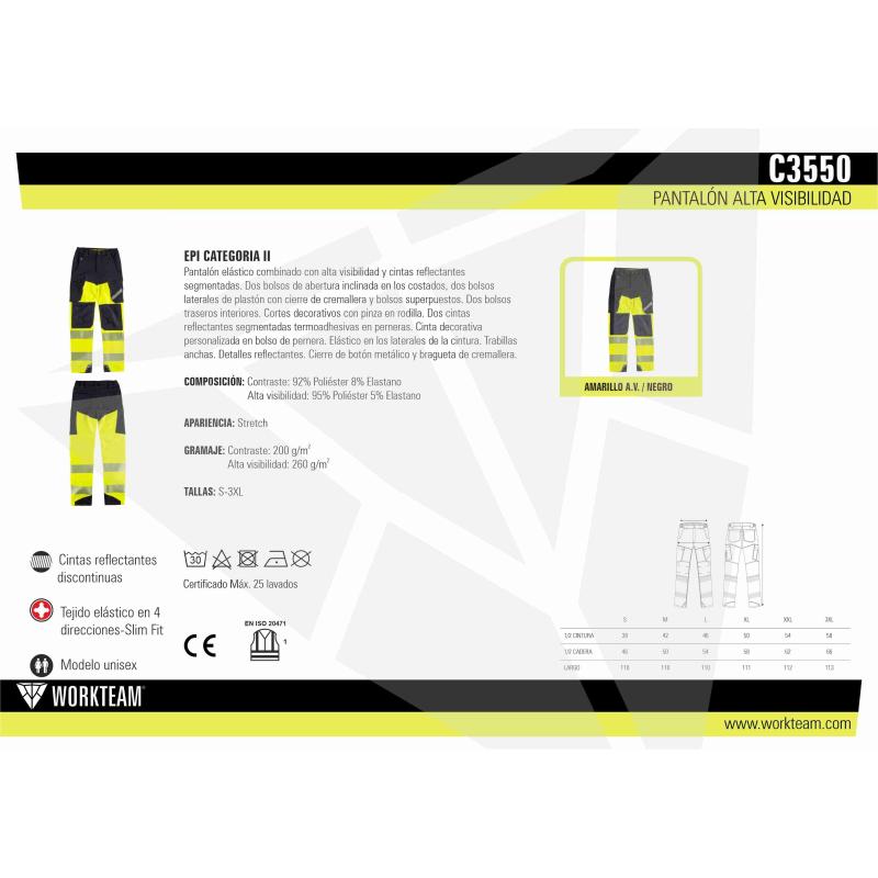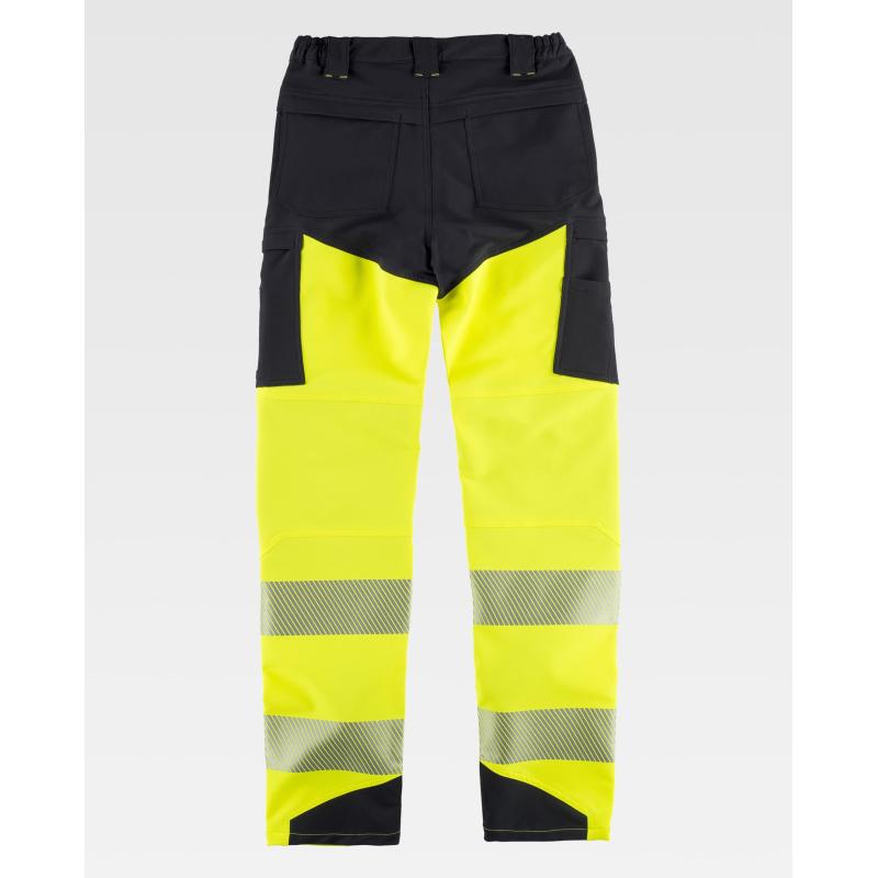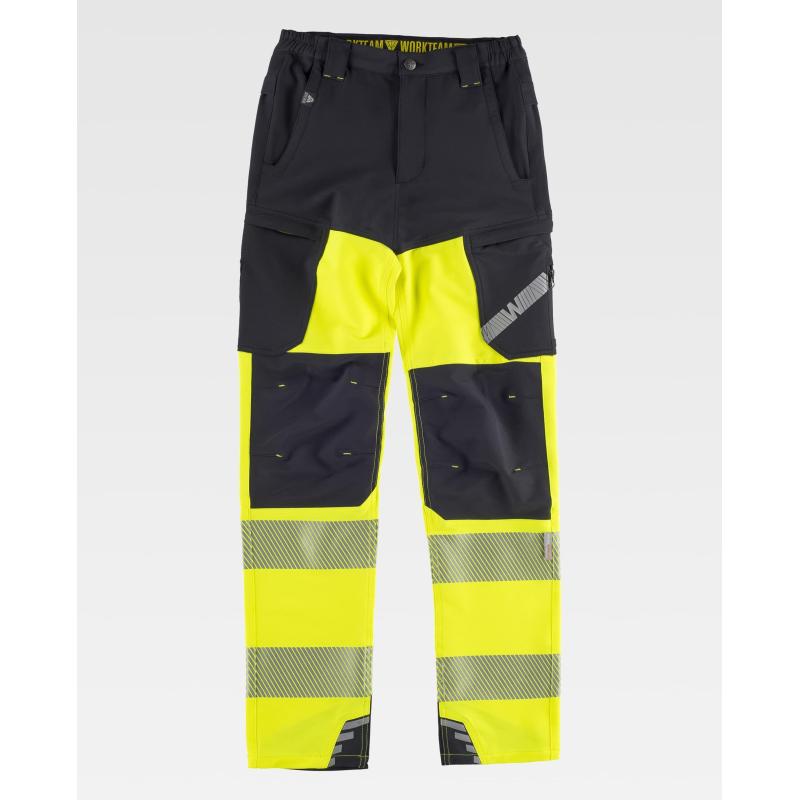 Pantalón elástico combinado con alta visibilidad y cintas reflectantes segmentadas. Dos bolsos de abertura inclinada en los costados, dos bolsos laterales de plastón con cierre de cremallera y bolsos superpuestos. Dos bolsos traseros interiores. Cortes decorativos con pinza en rodilla. Dos cintas reflectantes segmentadas termoadhesivas en perneras. Cinta decorativa personalizada en bolso de pernera. Elástico en los laterales de la cintura. Trabillas anchas. Detalles reflectantes. Cierre de botón metálico y bragueta de cremallera. 92% Poliéster 8% Elastano. A.V.: 95% Poliéster 5% Elastano