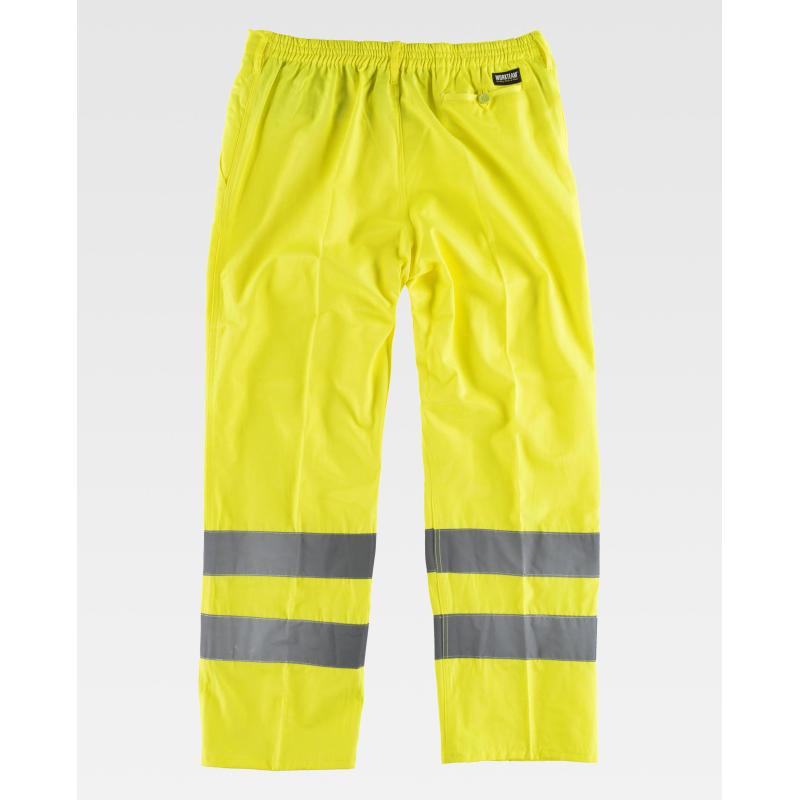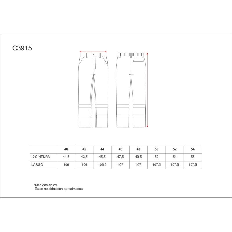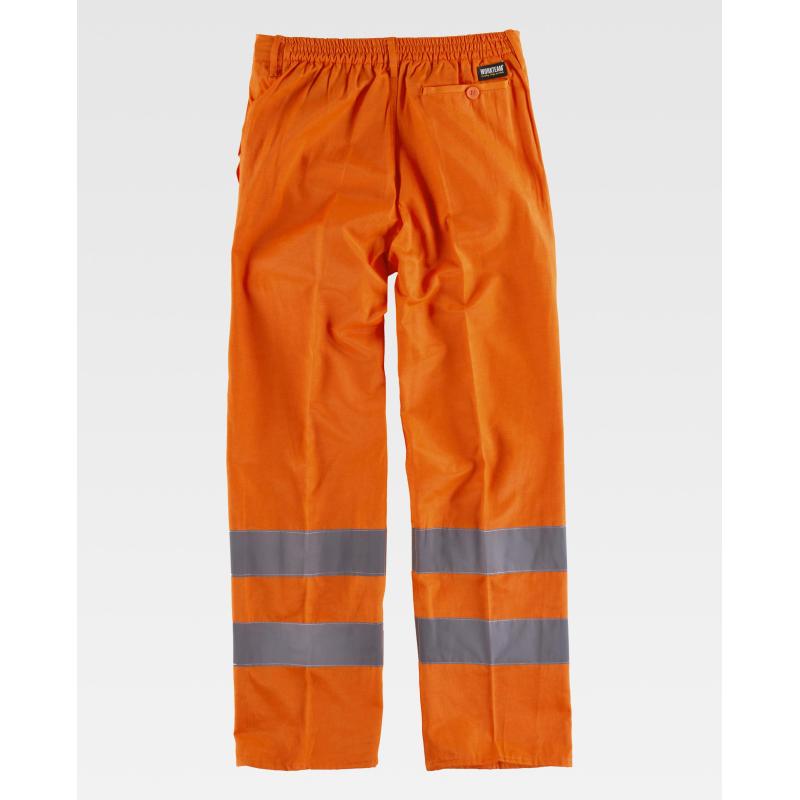 Pantalón de alta visibilidad con cintas reflectantes. Dos bolsos de abertura inclinada en los costados. Un bolso trasero de ojal con cierre de presilla y botón. Dos cintas reflectantes en perneras. Elástico en la cintura. Trabillas. Cierre de botón y bragueta de cremallera. 50% Poliéster 50% Algodón