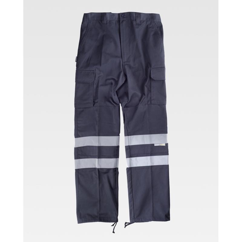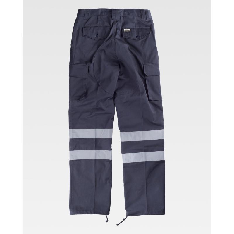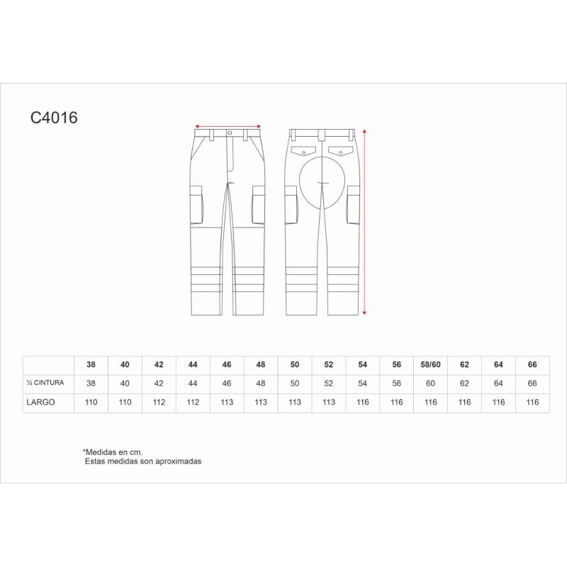 Pantalón con refuerzos y cintas reflectantes. Dos bolsos de abertura inclinada en los costados. Dos bolsos laterales de carga con cartera de botón oculto. Dos bolsos traseros interiores con carteras de pico y botón. Rodilleras y culera reforzadas. Dos cintas reflectantes en perneras. Sin elástico en cintura. Bajos ajustables con cordón. Trabillas anchas. Cierre de botón y bragueta de cremallera. 65% Poliéster 35% Algodón