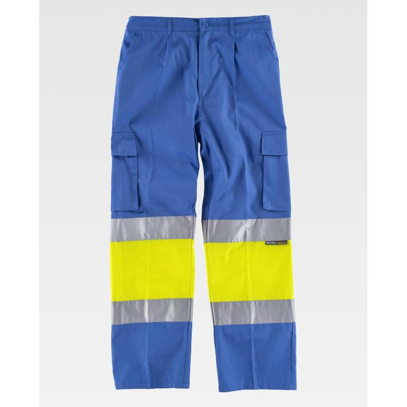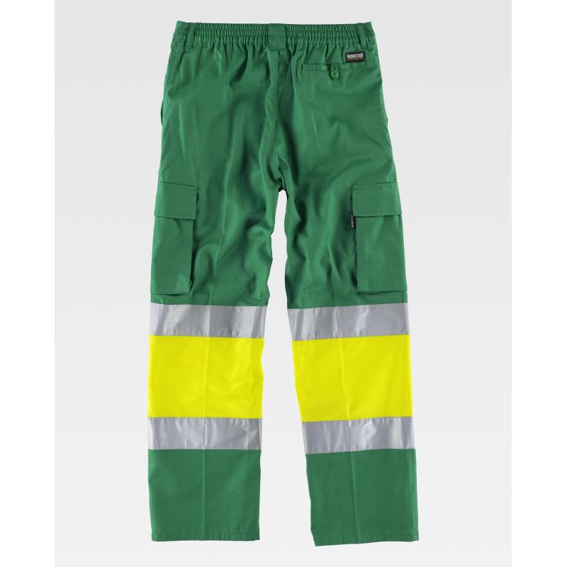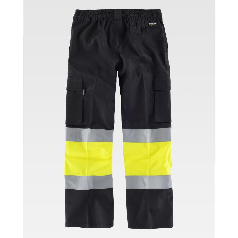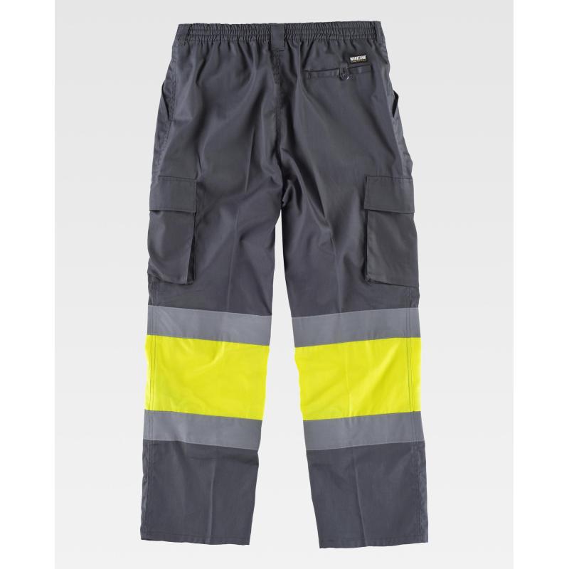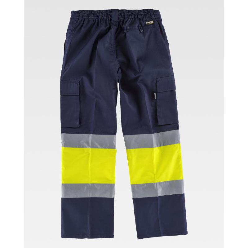 Pantalón combinado con alta visibilidad y cintas reflectantes. Dos bolsos de abertura inclinada en los costados, dos bolsos laterales de carga con cartera de velcro. Un bolso trasero interior con cierre de presilla y botón. Dos cintas reflectantes en perneras con pieza central de alta visibilidad. Elástico en la cintura. Trabillas. Cierre de botón y bragueta de cremallera. Prin. 65% Poliéster 35% Algodón / A.V. 50% Poliéster 50% Algodón