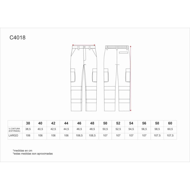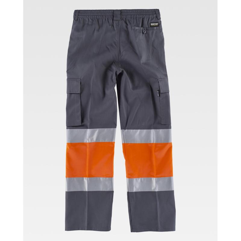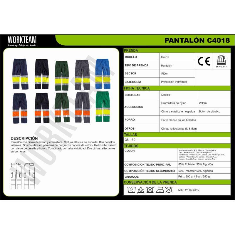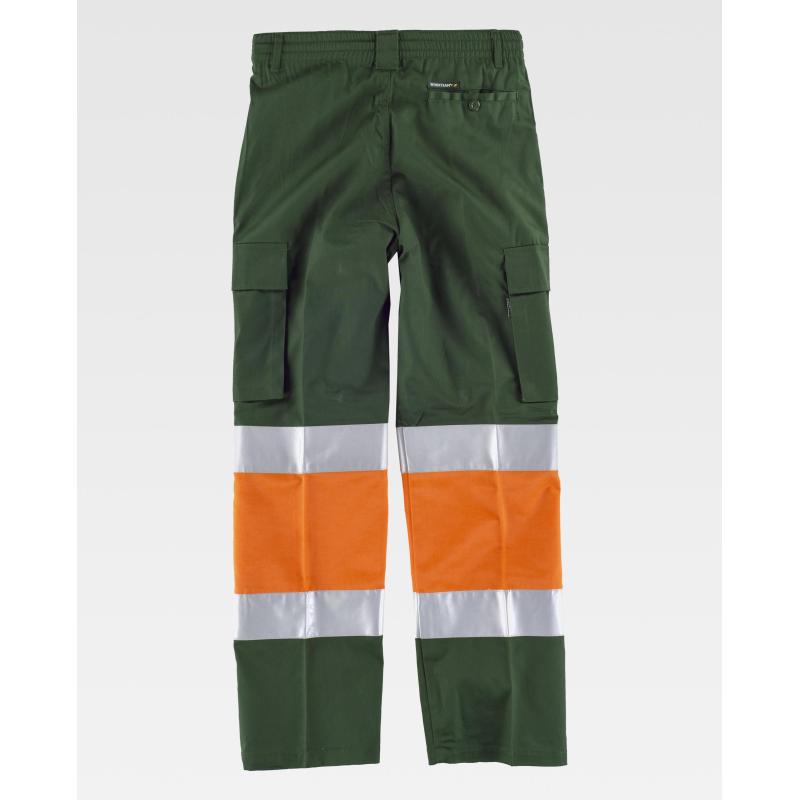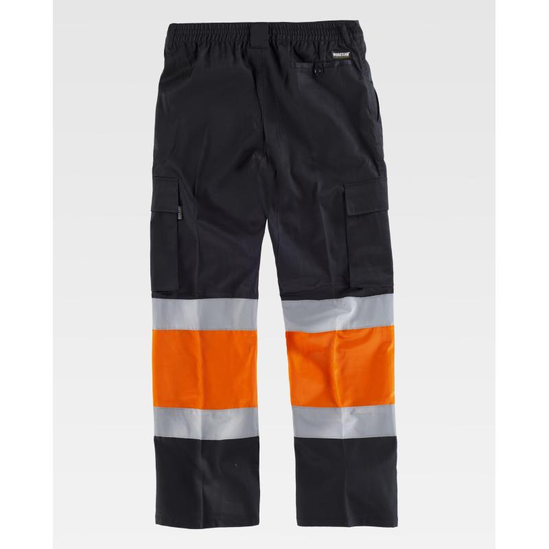 Pantalón combinado con alta visibilidad y cintas reflectantes. Dos bolsos de abertura inclinada en los costados, dos bolsos laterales de carga con cartera de velcro. Un bolso trasero interior con cierre de presilla y botón. Dos cintas reflectantes en perneras con pieza central de alta visibilidad. Elástico en la cintura. Trabillas. Cierre de botón y bragueta de cremallera. Prin. 65% Poliéster 35% Algodón / A.V. 50% Poliéster 50% Algodón