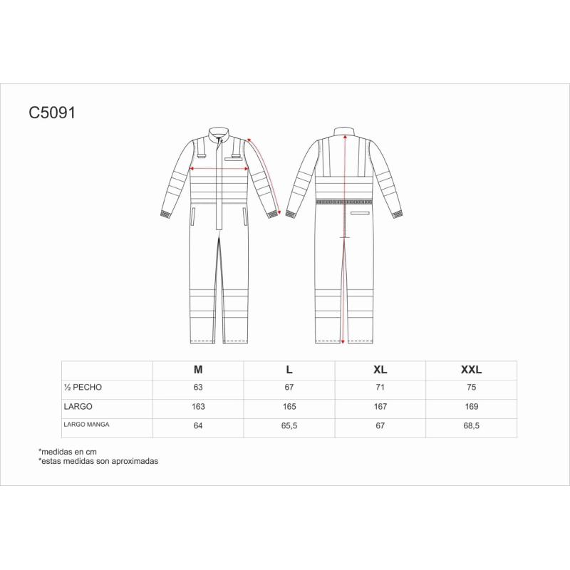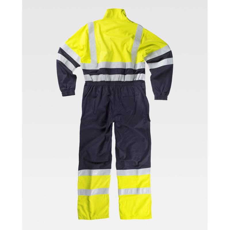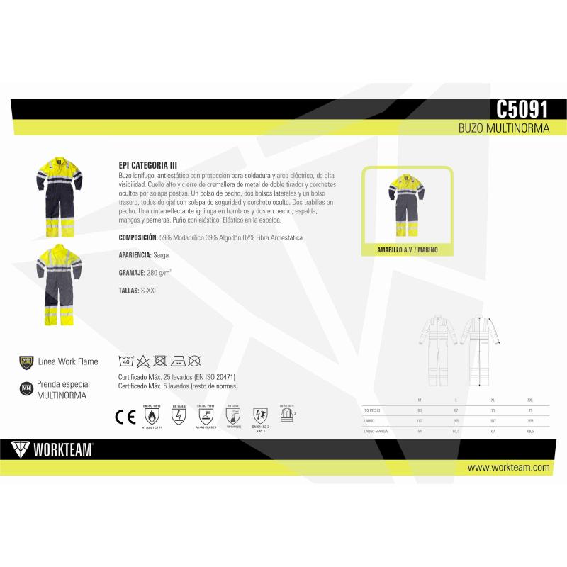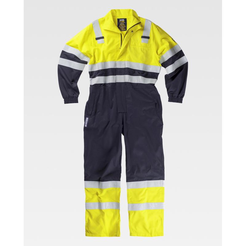 Buzo ignífugo, antiestático con protección para soldadura y arco eléctrico, de alta visibilidad. Cuello alto y cierre de cremallera de metal de doble tirador y corchetes ocultos por solapa postiza. Un bolso de pecho, dos bolsos laterales y un bolso trasero, todos de ojal con solapa de seguridad y corchete oculto. Dos trabillas en pecho. Una cinta reflectante ignífuga en hombros y dos en pecho, espalda, mangas y perneras. Puño con elástico. Elástico en la espalda. 59% Modacrílico 39% Algodón 2% Fibra Antiestática