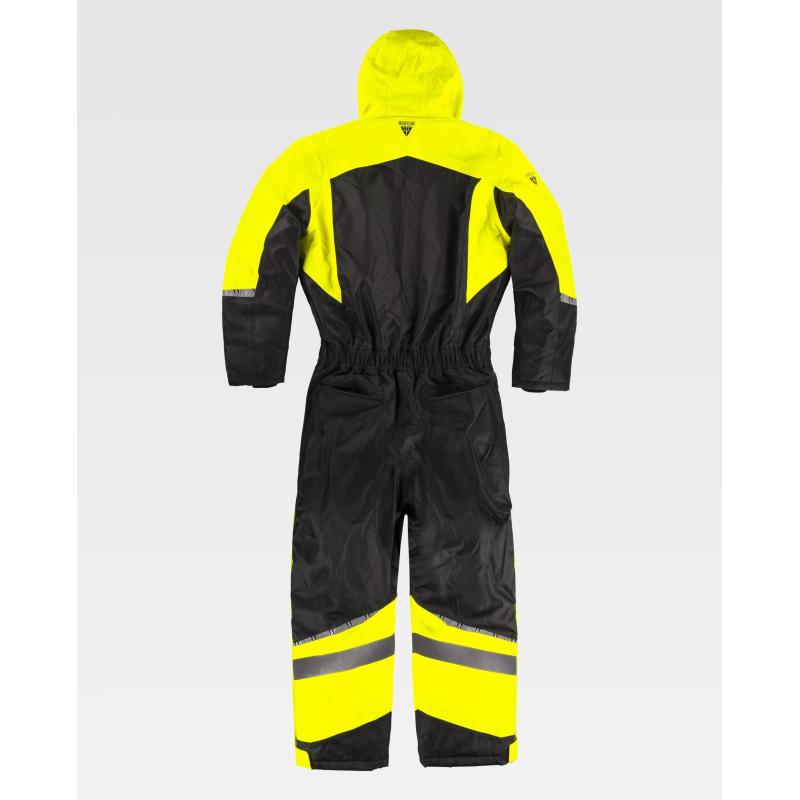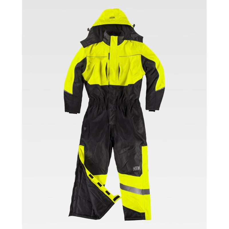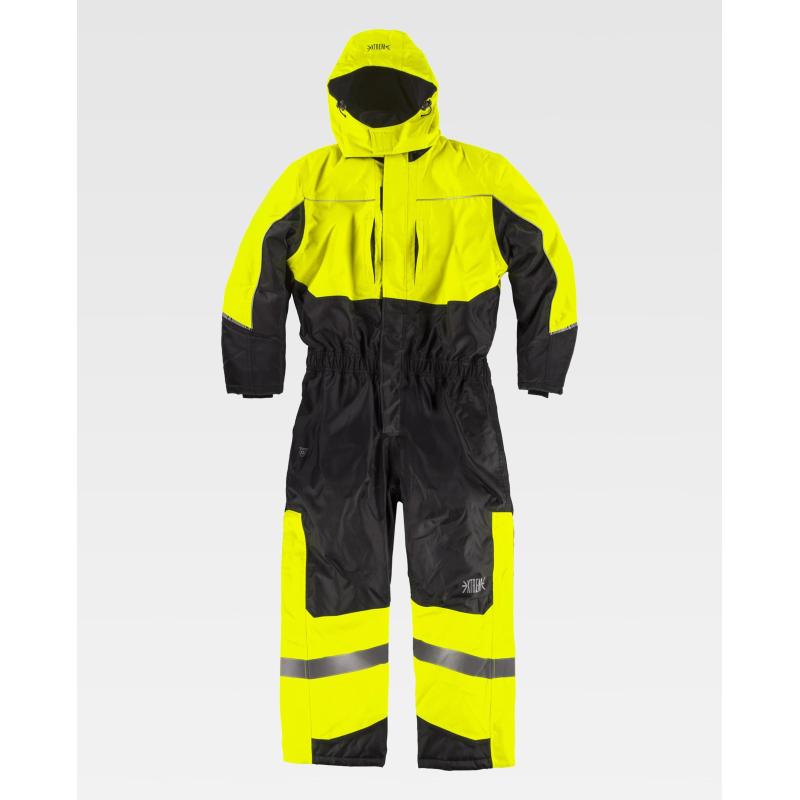 Buzo impermeable acolchado, de visibilidad realzada con cintas reflectantes y tejido Ripstop. Cuello alto y capucha forrada con polar, ajustable con cordón elástico. Cierre de cremallera oculta por solapa postiza con velcro. Dos bolsos de pecho con cierre de cremallera. Dos bolsos de abertura inclinada con cierre de cremallera en los costados. Dos bolsos traseros con cierre de cremallera. Una cinta reflectante en perneras. Cinta decorativa personalizada. Vivo reflectante. Puño elástico en el interior de la manga. Elástico en la espalda. Abertura en perneras con cierre de cremallera y velcro en el bajo. Tejido especial contra temperaturas inferiores a -5ºC. 100% Poliester