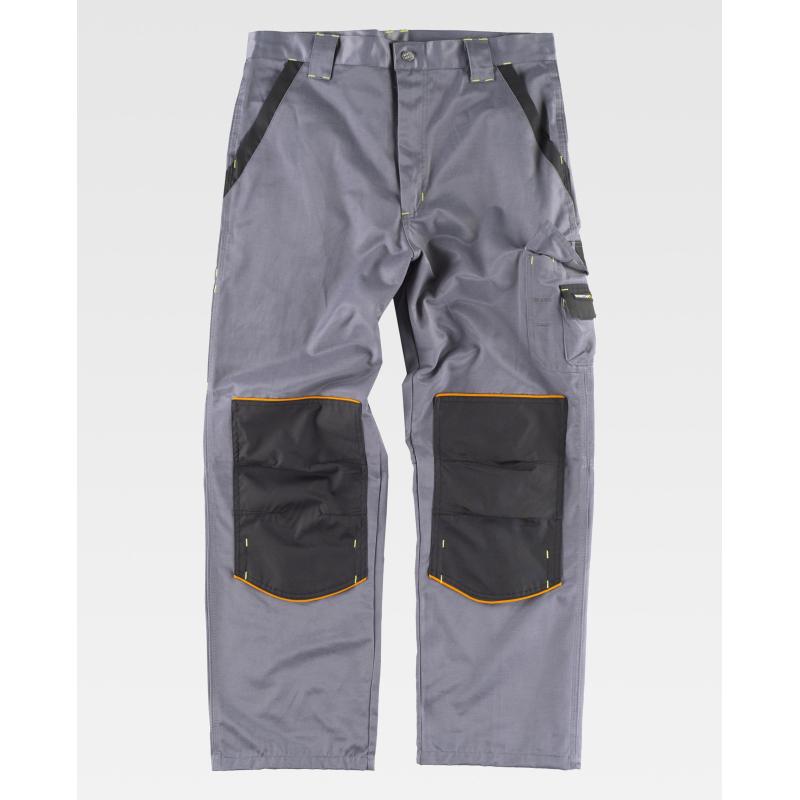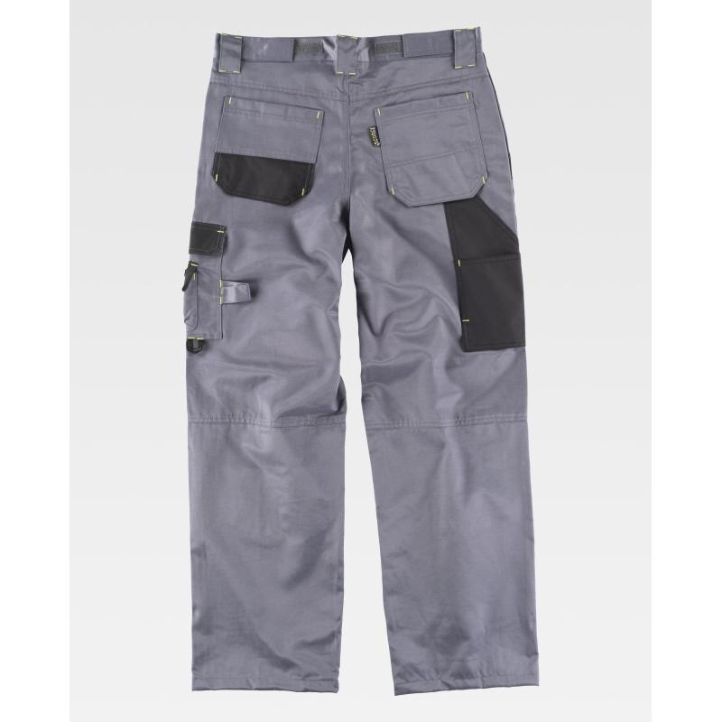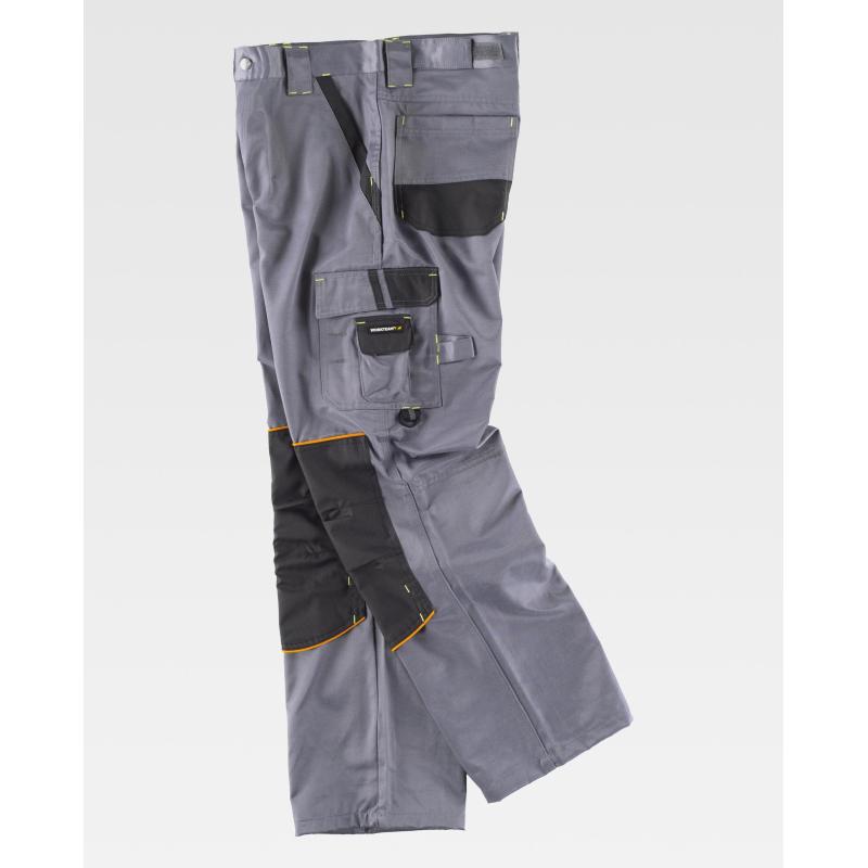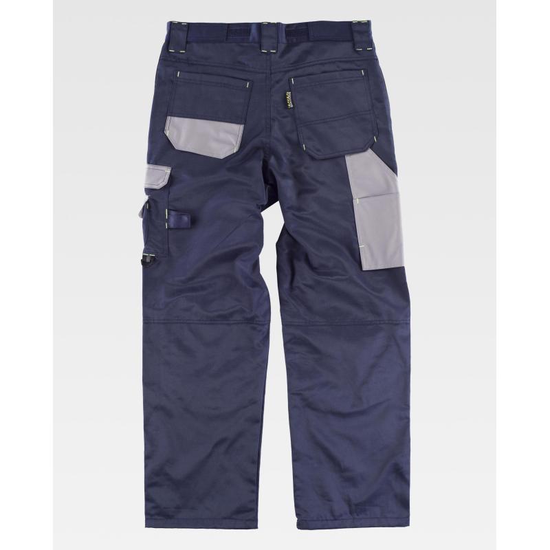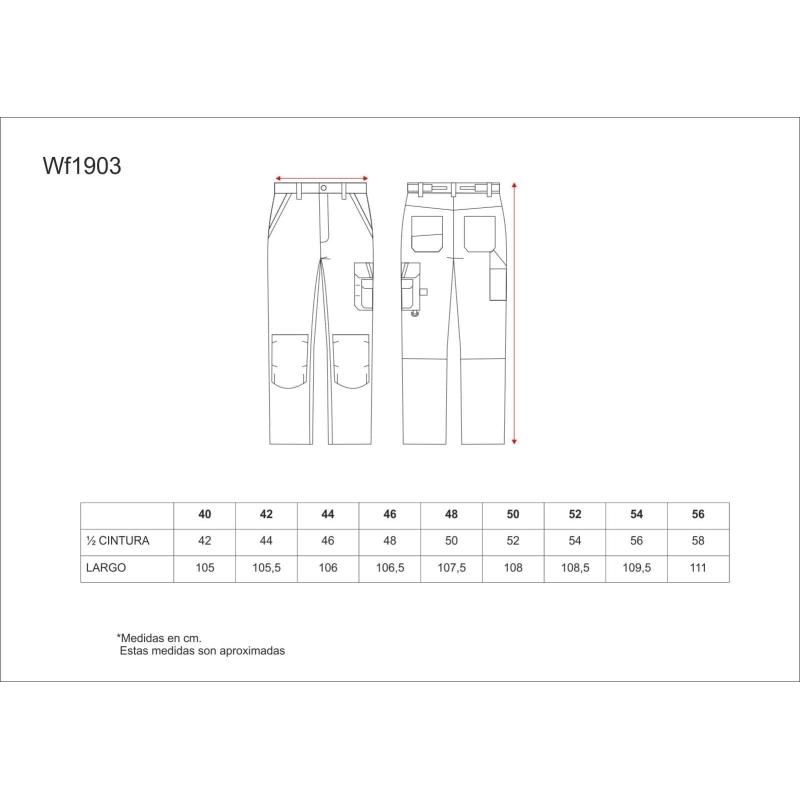 Pantalón combinado con refuerzos y triple costura en tejido Beaver Nylon de alta resistencia, antimanchas y repelente a líquidos. Dos bolsos de abertura inclinada en los costados. Un bolso lateral de carga con argolla y bolsillo auxiliar superpuesto, ambos con cartera de velcro. Dos bolsos traseros con pliegue inferior y cierre de velcro, y un bolso de espátula doble. Trabilla porta martillo. Refuerzo con vivos a contraste y cierre de velcro para rodilleras de protección. Ajuste de velcro en los laterales de la cintura. Trabillas anchas. Cierre de botón metálico y bragueta de cremallera. 50% Poliéster 50% Algodón