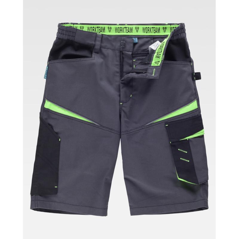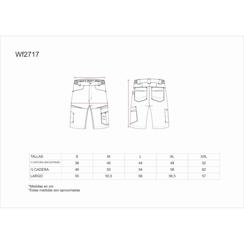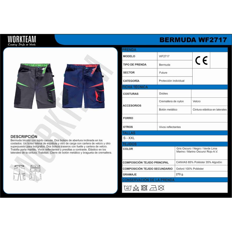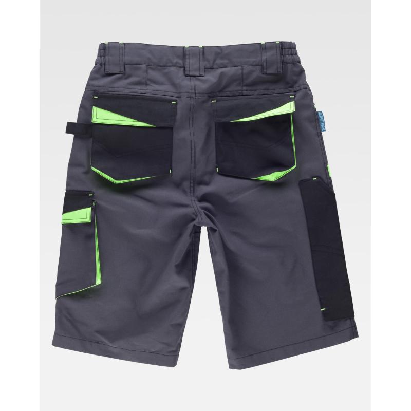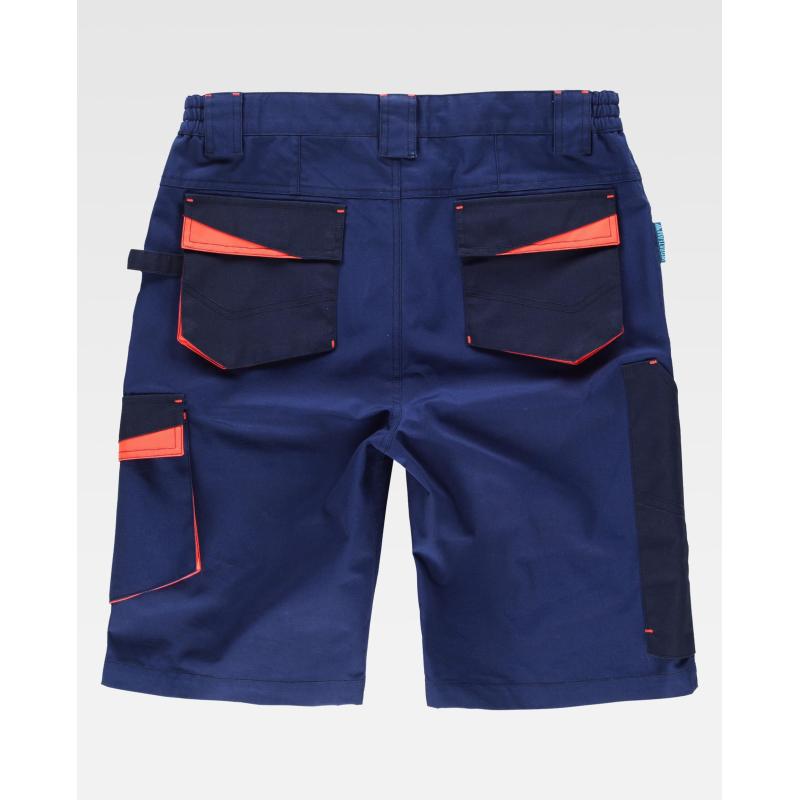Bermuda tricolor con tejido canvas. Dos bolsos de abertura inclinada en los costados. Un bolso lateral de espátula y otro de carga con cartera de velcro y otro superpuesto para bolígrafos. Dos bolsos traseros con fuelle y cartera de velcro. Trabilla porta martillo. Vivos reflectantes y presillas a contraste. Elástico en los laterales de la cintura. Trabillas. Cierre de botón metálico y bragueta de cremallera. 65% Poliéster 35% Algodón