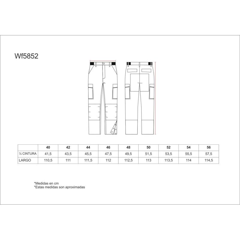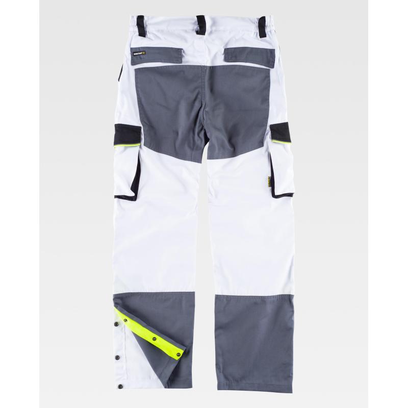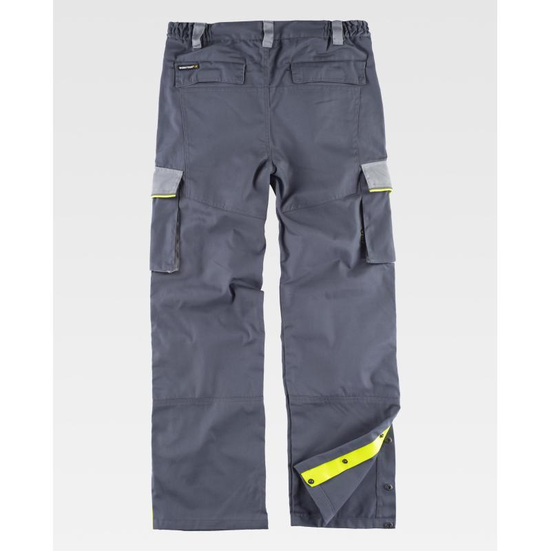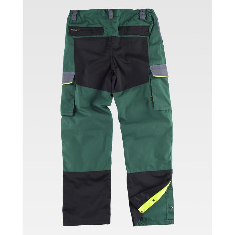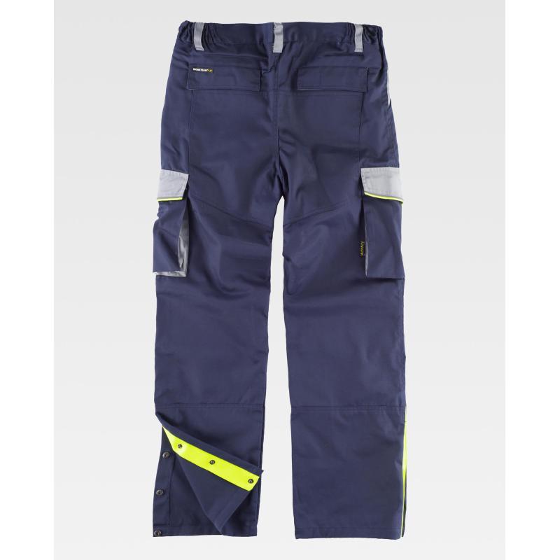 Pantalón tricolor con refuerzos, abertura en perneras y vivos de alta visibilidad. Dos bolsos de abertura inclinada en los costados, dos bolsos laterales de carga con cartera de velcro. Dos bolsos traseros interiores con cartera de velcro. Carteras rematadas con doble vivo. Refuerzo con cierre de cremallera para rodilleras de protección. Refuerzo en culera. Abertura en perneras con cierre de corchetes. Elástico en los laterales de la cintura. Trabillas. Cierre de corchete y bragueta de cremallera. 65% Poliéster 35% Algodón