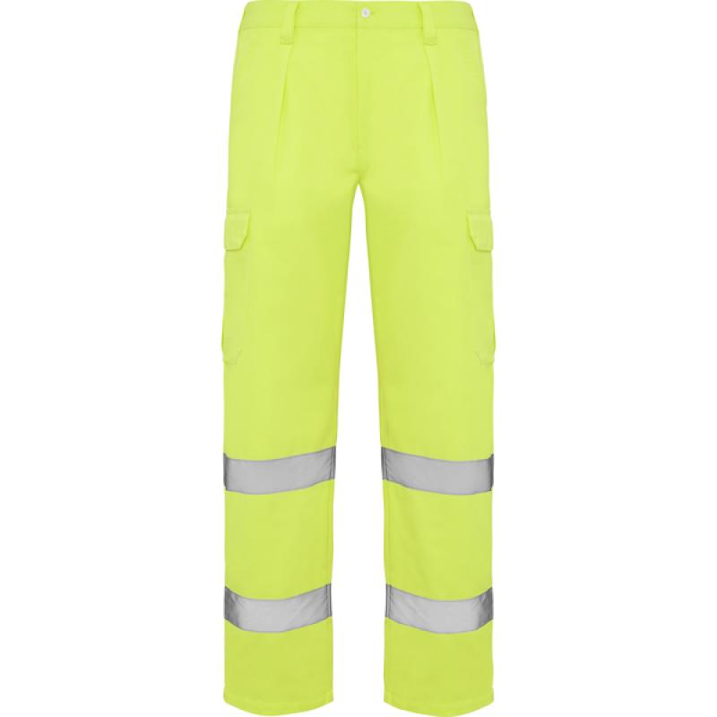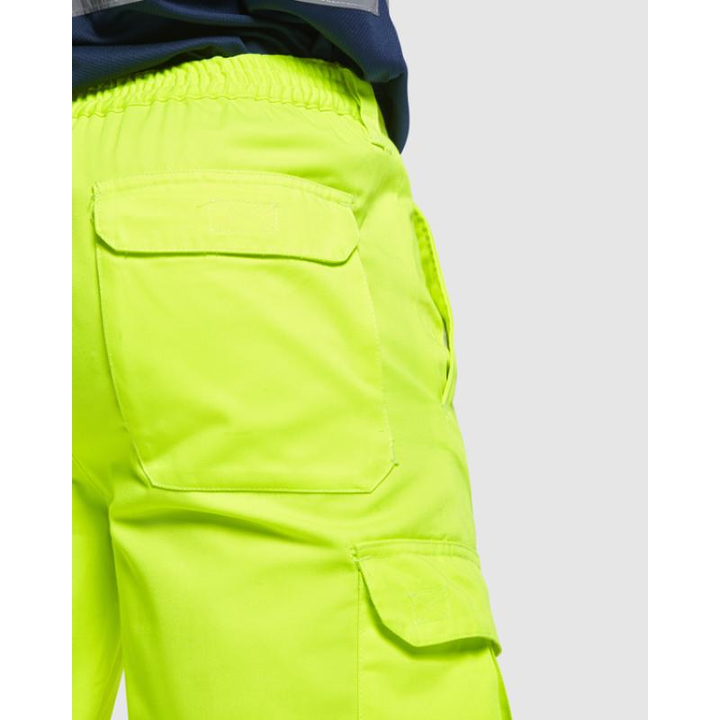 Pantalón largo multibolsillos de alta visibilidad.·Tejido resistente.·Cinturilla elástica en la parte trasera.·Dos bolsillos frontales.·Dos bolsillos traseros con tapeta y cierre de velcro.·Dos bolsillos cargo con tapeta y cierre de velcro.·Dos cintas reflectantes en las piernas.·Etiquetado Roly WRK exterior.·Ciclos de lavado: x25