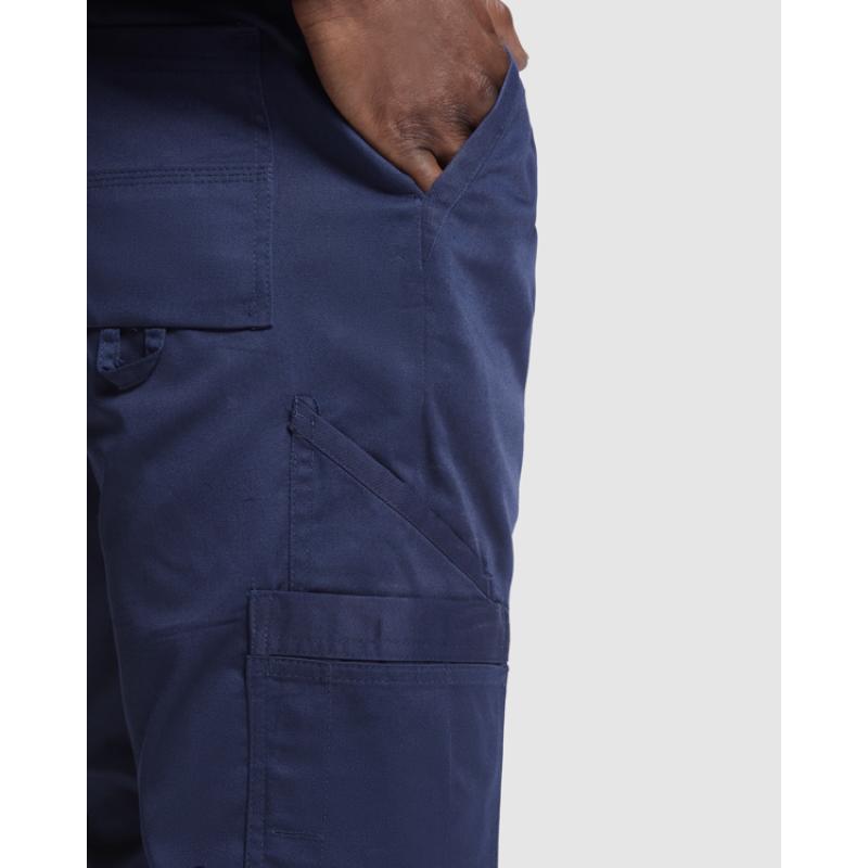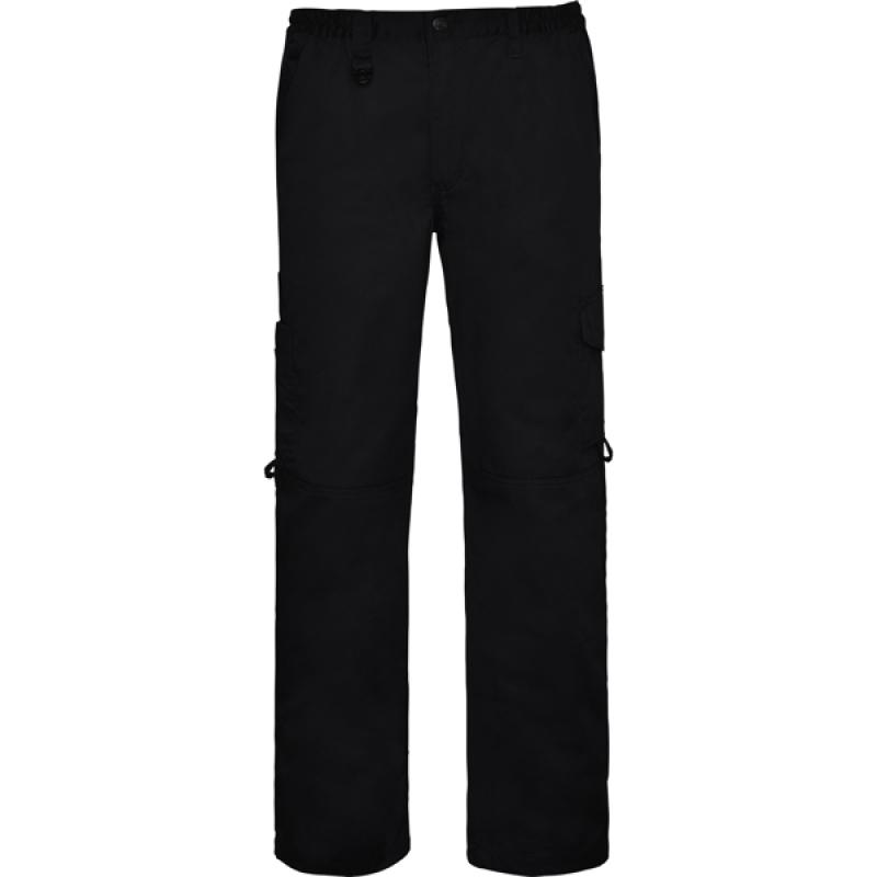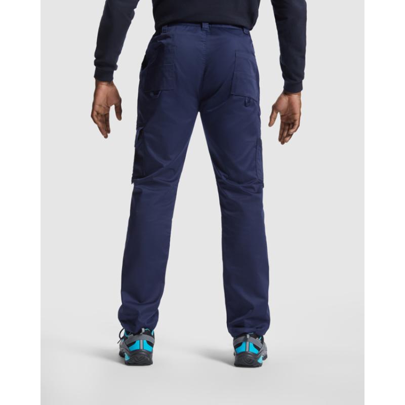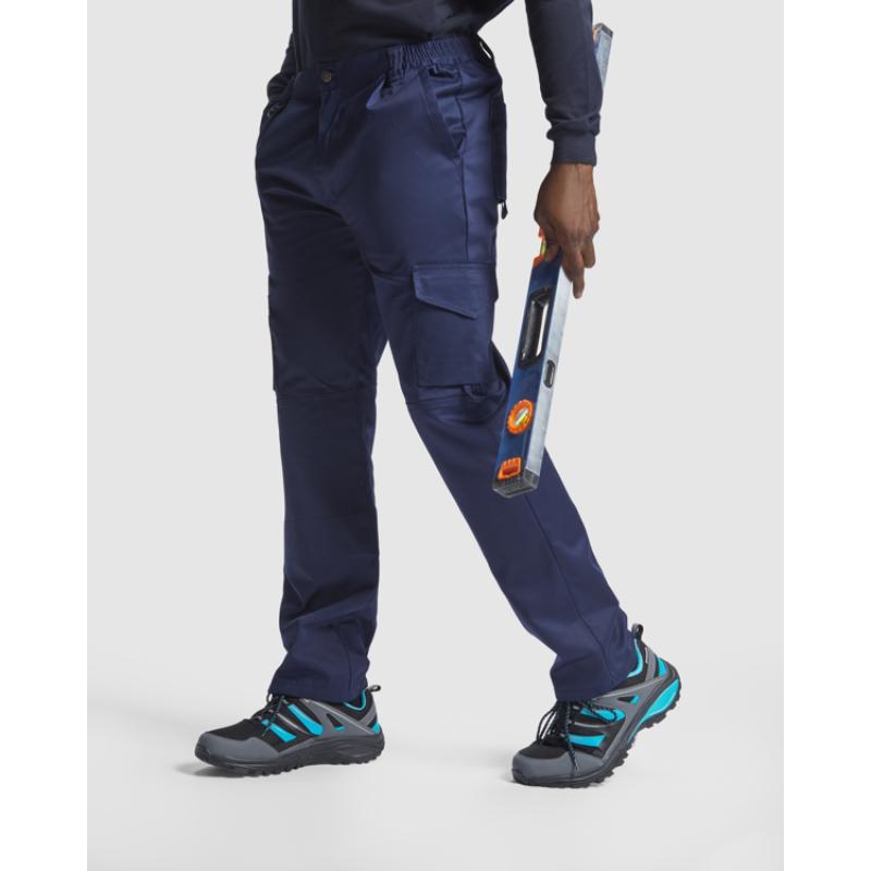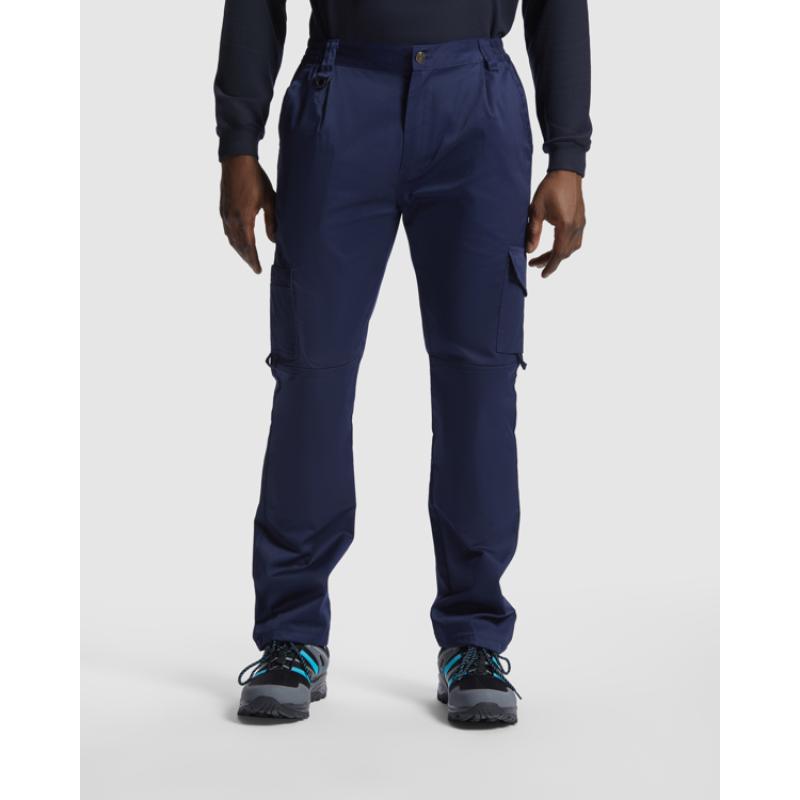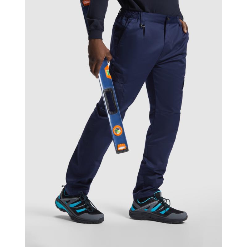 Pantalón largo multibolsillos con botón metálico personalizado.· Tejido resistente, doble tejido de refuerzo en las rodillas.· Cintura engomada en los laterales con trabillas, la de la derecha con una argolla de plástico.· Dos bolsillos frontales a la cadera con vivo del mismo tejido.· Bolsillo interior con cremallera dentro del bolsillo frontal derecho.· Dos bolsillos plaqué traseros con dos asas del mismo tejido.· Un bolsillo cargo con tapeta y cierre de velcro en pierna izquierda y un asa del mismo tejido.· Bolsillo multiusos en pierna derecha.· Etiquetado Roly WRK exterior.