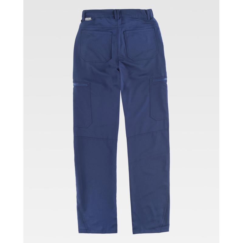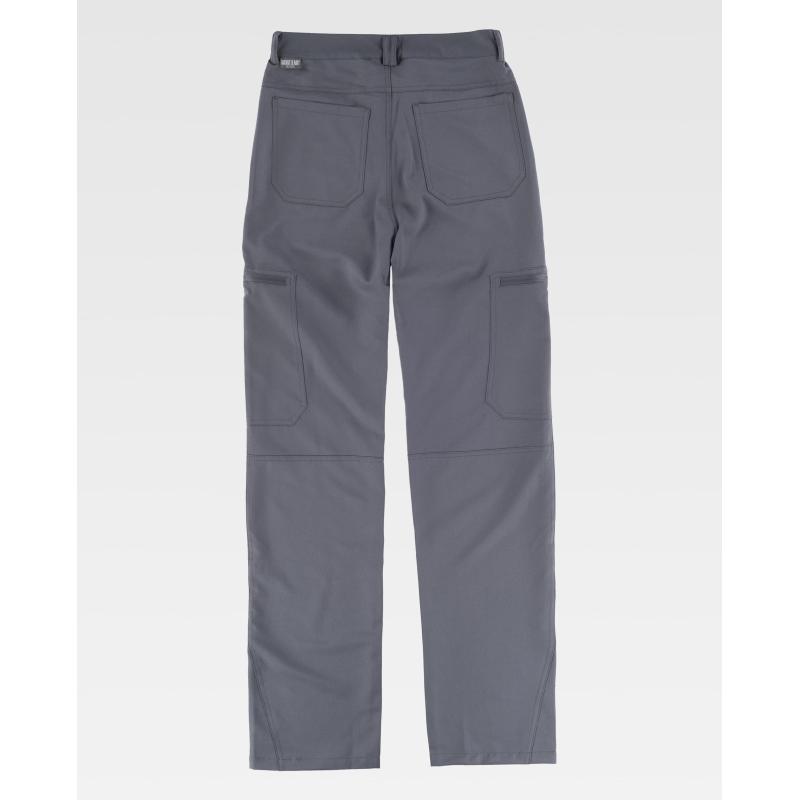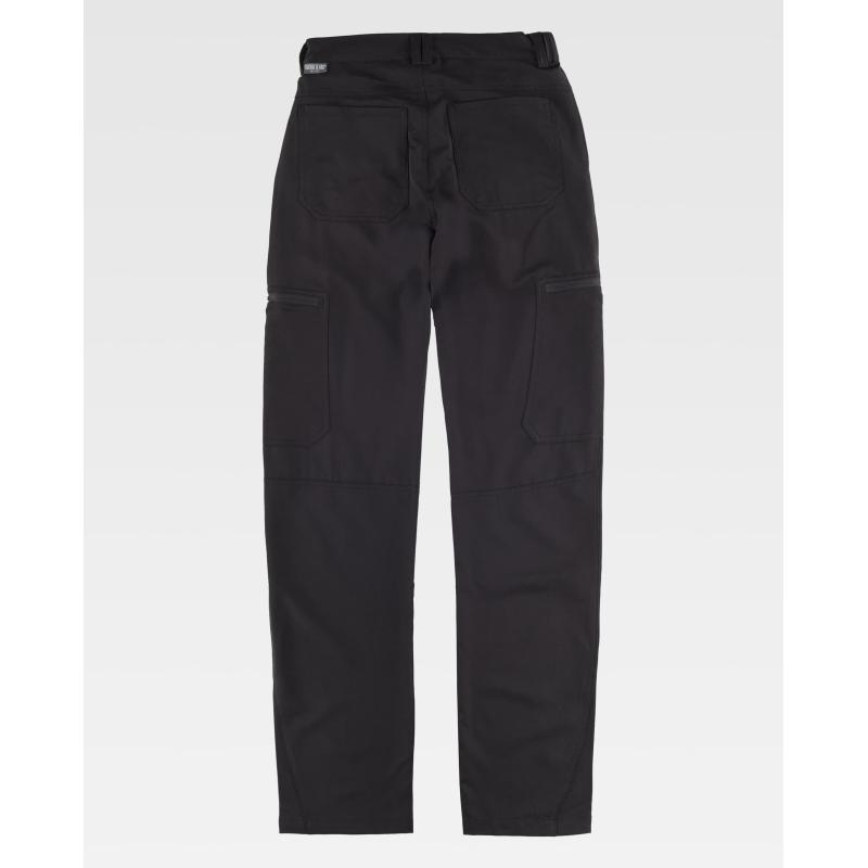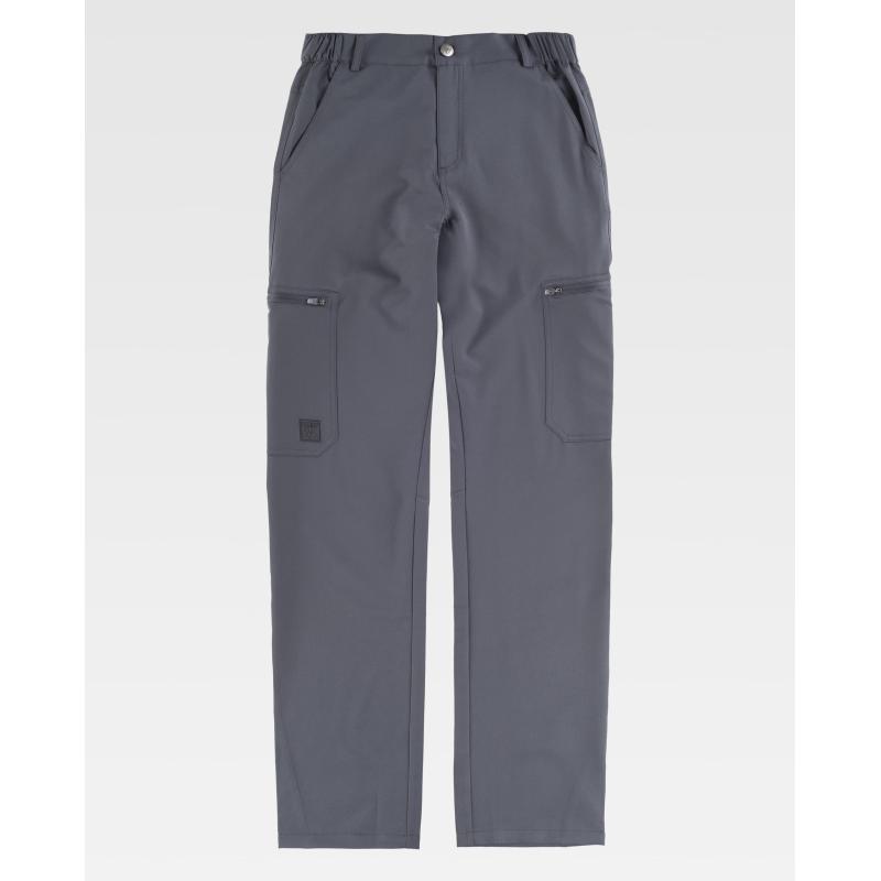 Pantalón elástico con dos bolsos de abertura inclinada en los costados. Dos bolsos de plastón con cierre de cremallera en perneras y dos bolsos traseros de plastón. Elástico en los laterales de la cintura. Trabillas. Cierre de botón metálico y bragueta de cremallera. 91% Poliéster 9% Elastano