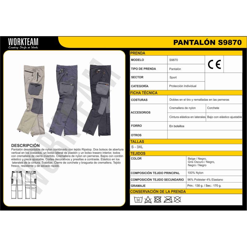 Pantalón desmontable de nylon combinado con tejido Ripstop. Dos bolsos de abertura vertical en los costados, un bolso lateral de plastón y un bolso trasero interior, todos con cremallera de cierre invertido. Cremallera de nylon en perneras. Bajos con cordón elástico y pieza ajustable. Cortes decorativos y presillas a contraste. Elástico en los laterales de la cintura. Trabillas. Cierre de corchete y bragueta de cremallera. Tejido fresco, resistente y de secado rápido. Prin. 100% Nylon / Sec. 96% Poliéster 4% Elastano