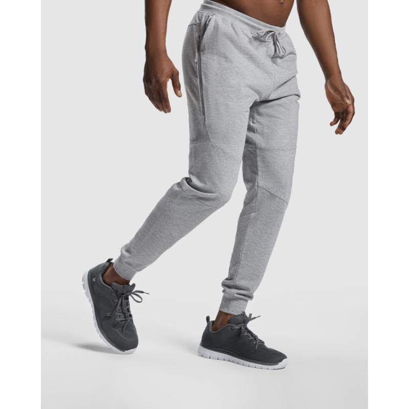 Pantalón largo entallado al tobillo. Cinturilla engomada con cordón ajustable y ojales metálicos. Bolsillos laterales con cremallera. Bolsillo extra grande insertado en costura lateral derecha con cremallera invertida. Cortes transversales a la altura del muslo. Puños en rib 1x1. Canesú trasero.