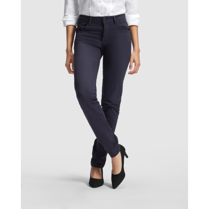 Pantalón largo mujer.· Tejido stretch.· Cierre con cremallera y botón metálico personalizado.· Trabillas en la cintura para cinturón.· Bolsillos frontales a la cadera.· Dos bolsillos traseros de ojal con botón.