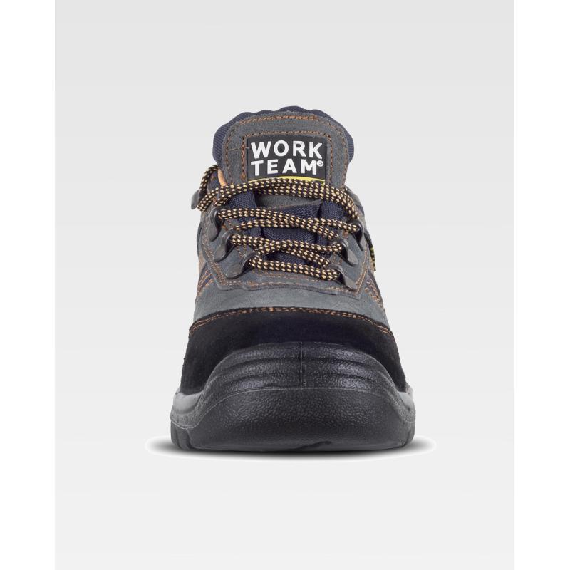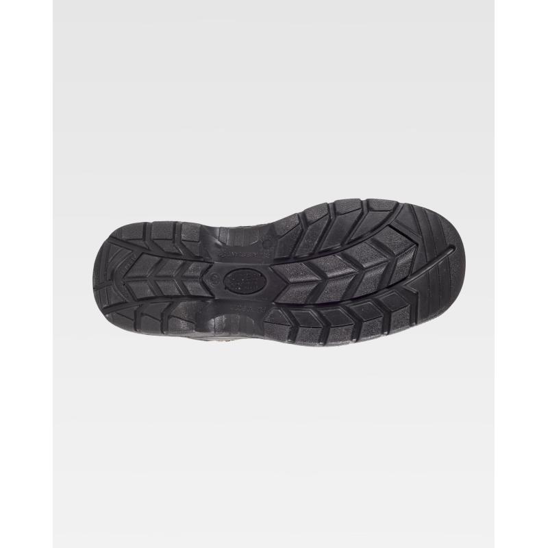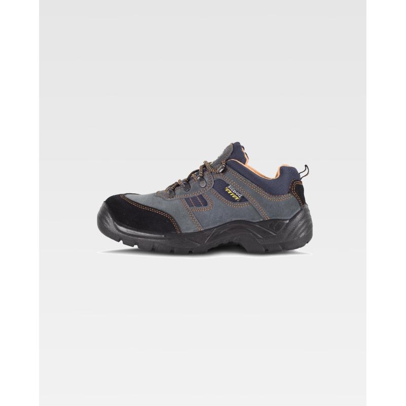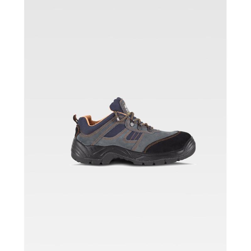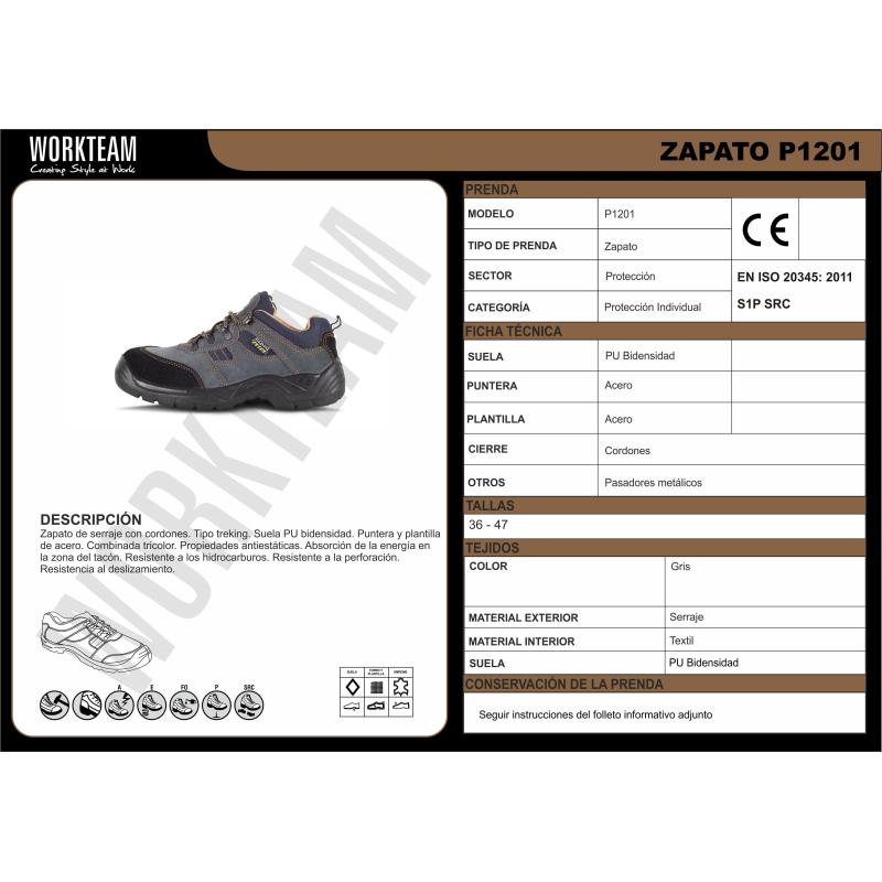 Zapato de serraje con cordones. Tipo treking. Suela PU bidensidad. Puntera y plantilla de acero. Propiedades antiestáticas. Absorción de la energía en la zona del tacón. Resistente a los hidrocarburos. Resistente a la perforación. Resistencia al deslizamiento sobre baldosa cerámica con disolución de jabón y sobre acero con glicerina. Piel Serraje